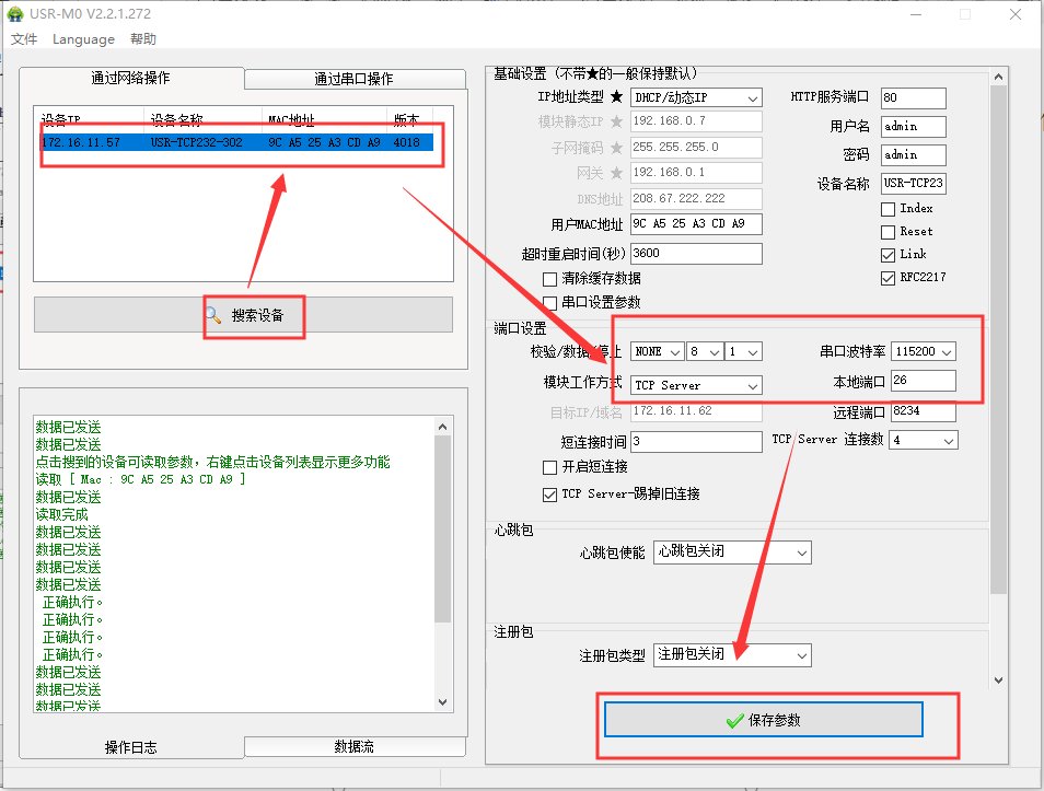 點(diǎn)擊“搜索設(shè)備”,當(dāng)搜索列表中出現(xiàn)302的設(shè)備后,單擊搜索到的設(shè)備,設(shè)置配置信息并保存