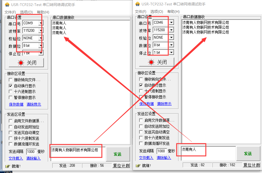 同時打開兩個串口轉(zhuǎn)網(wǎng)絡(luò)助手軟件。一個選擇虛擬串口,一個選擇COM9,即可進(jìn)行收發(fā)測試