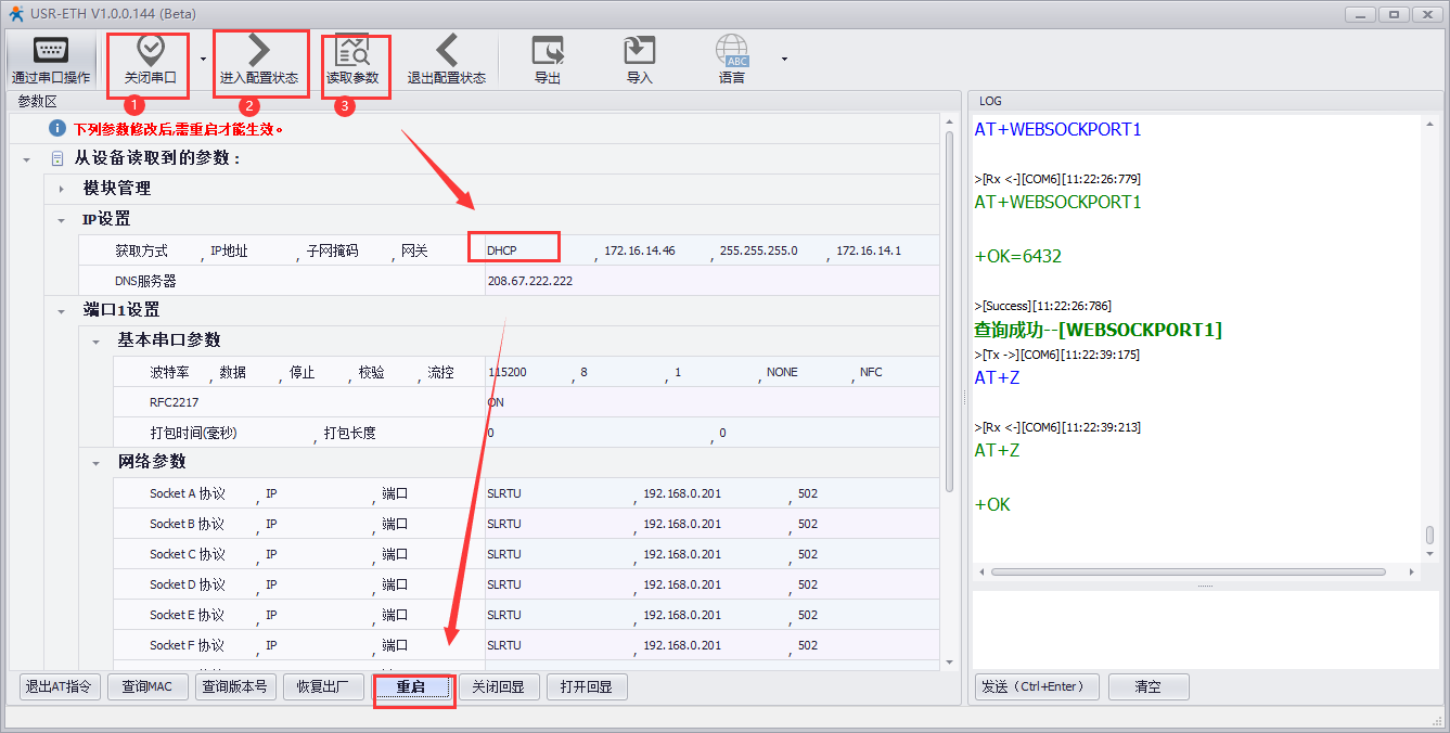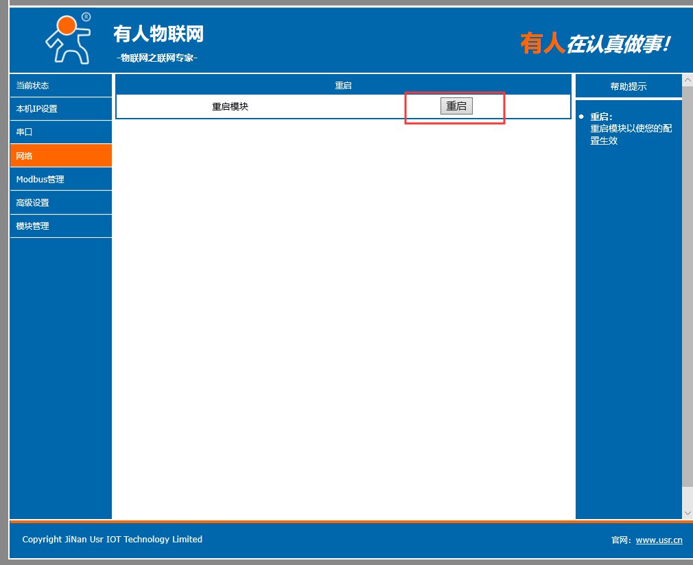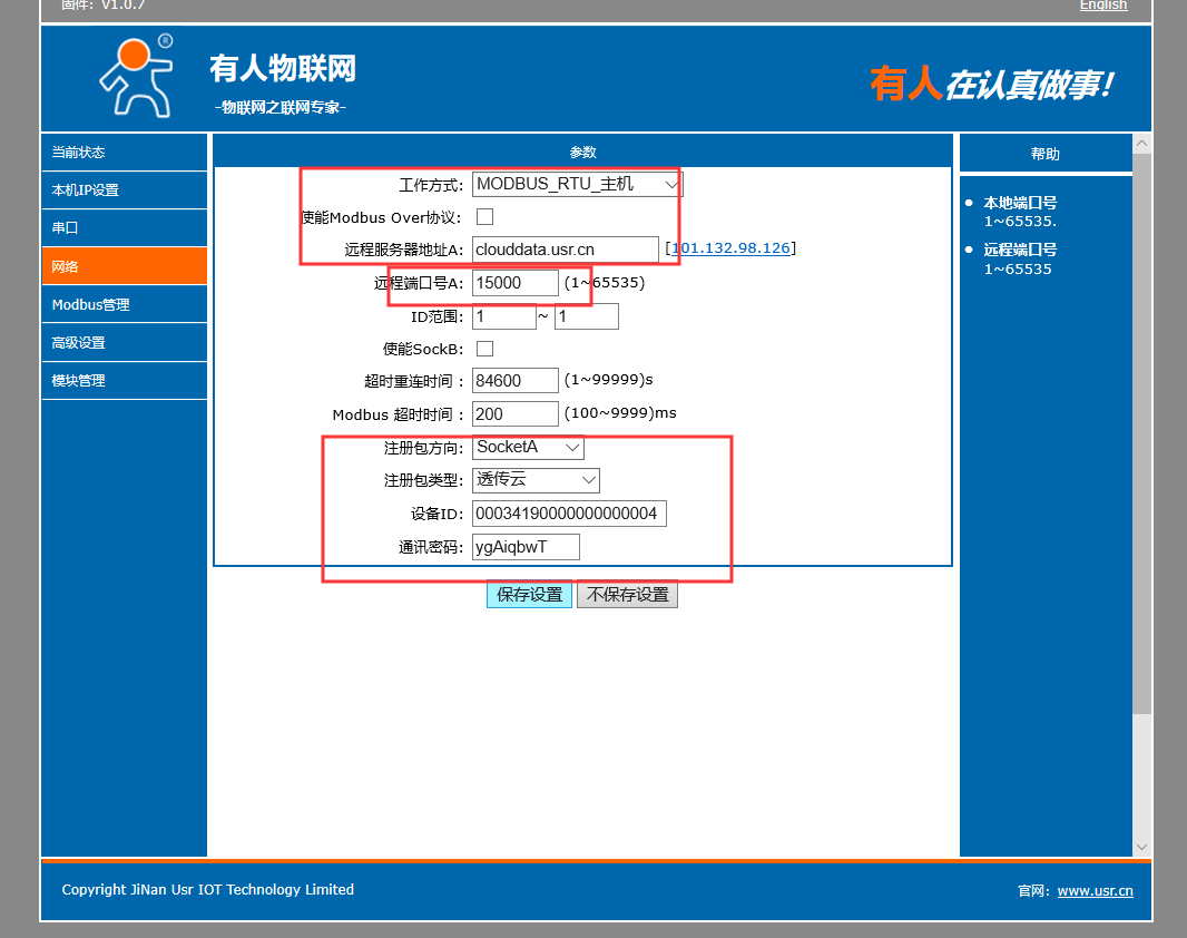 5.設(shè)置相關(guān)參數(shù)。選擇工作方式為MODBUS TU,遠(yuǎn)程服務(wù)器為clouddata.usr.cn,端口號為15000。開啟注冊包,注冊包使用SOCKET A、透傳云。設(shè)備ID是通過有人云中設(shè)備列表查看按鈕查看設(shè)備SN與通訊密碼,填寫入內(nèi)置網(wǎng)頁。