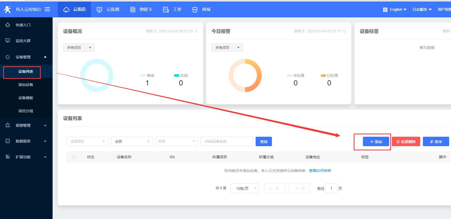 3.注冊有人云通行證,通過通行證進入有人云,在設(shè)備管理中通過ID方式添加設(shè)備,設(shè)備模板選擇modbusrtu。