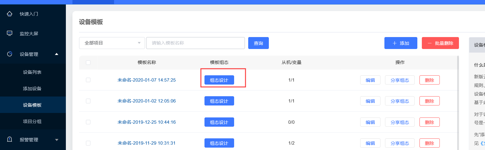 8.將進入設(shè)備管理——設(shè)備模板——組態(tài)設(shè)計,拖拽控件綁定數(shù)據(jù)點,完成組態(tài)繪制