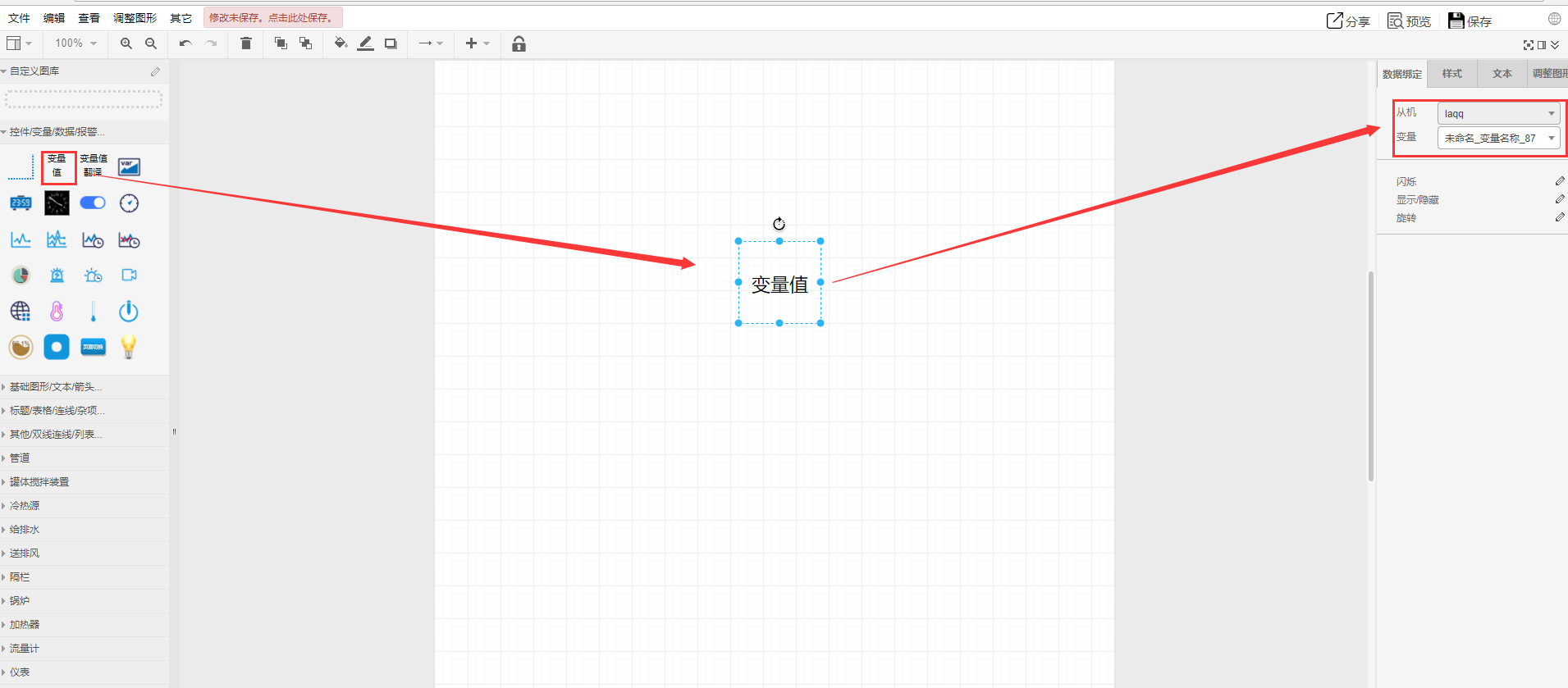 9.進入組態(tài)設(shè)計,在左側(cè)控件欄選擇設(shè)備模板中所添加設(shè)備數(shù)據(jù)點的展示類型控件,這里以數(shù)值型數(shù)據(jù)為例,拖拽變量值控件至畫布,最左側(cè)綁定數(shù)據(jù)點,點擊保存預(yù)覽后,即可在大屏展示組態(tài)。