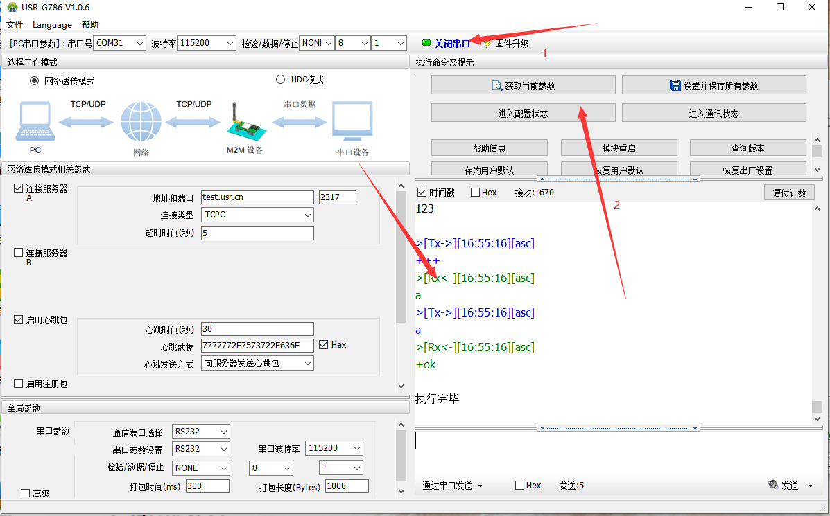 1.打開串口,進(jìn)入配置狀態(tài),返回OK表示進(jìn)入正常狀態(tài)