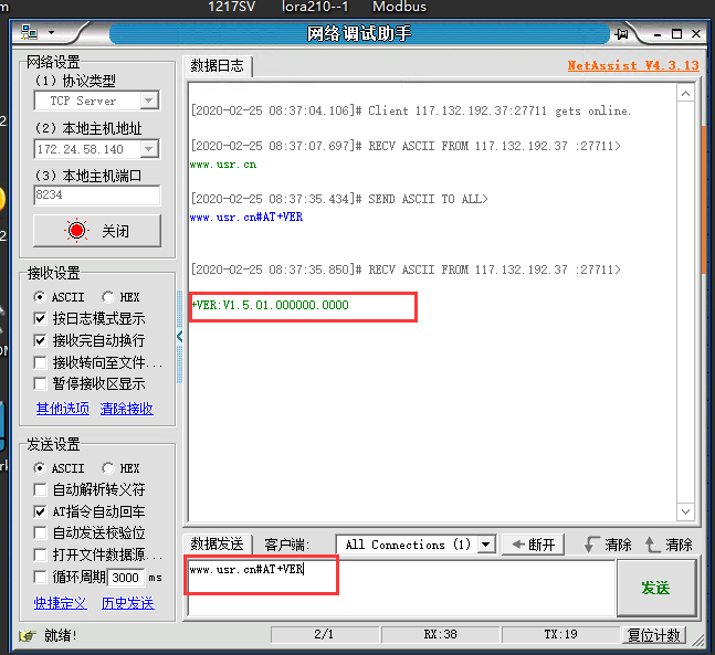 4. 連接成功后,可以從服務(wù)器端發(fā)送網(wǎng)絡(luò)AT指令來查詢/設(shè)置DTU的參數(shù)