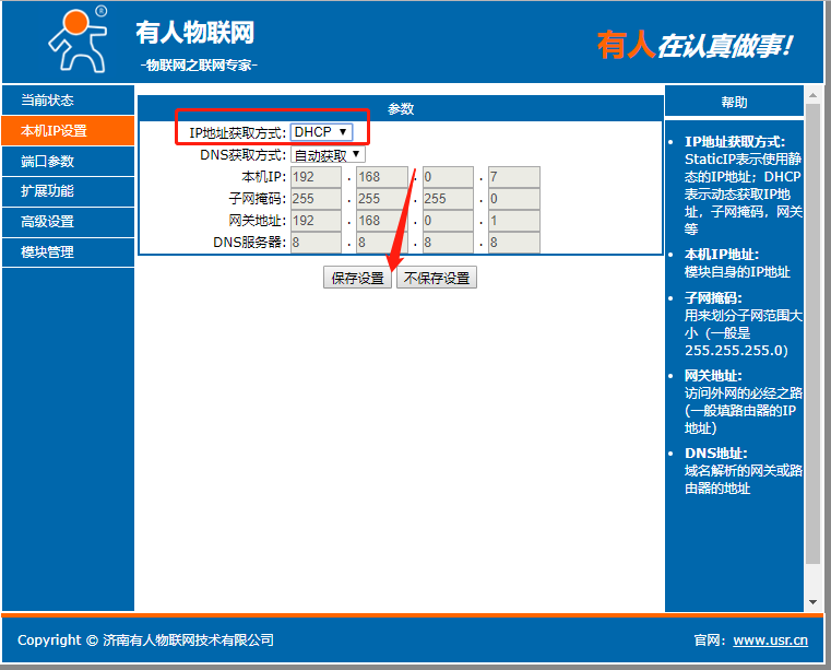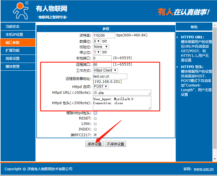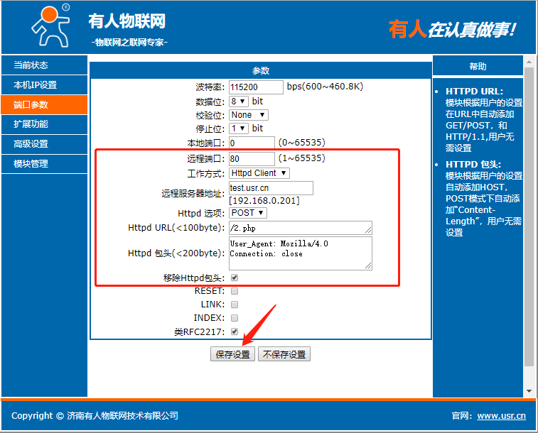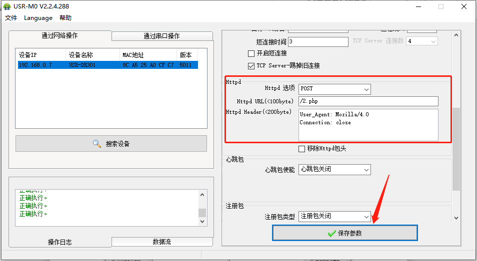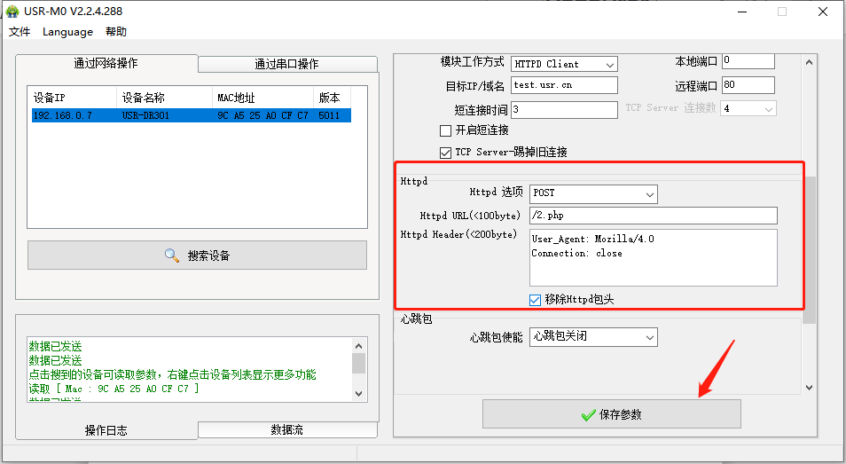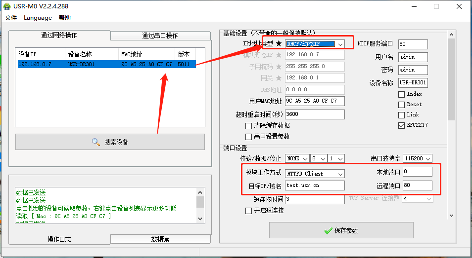 點擊“搜索設(shè)備”當(dāng)搜索列表中出現(xiàn)301的設(shè)備后,單擊搜索到的設(shè)備,IP設(shè)置為DHCP,模塊設(shè)置為Httpd Client模式,請求方式POST,URL為/2.php,設(shè)置服務(wù)器地址test.usr.cn,端口80,設(shè)置并保存所有參數(shù),重啟模塊。(本說明文檔使用為有人測試服務(wù)器)