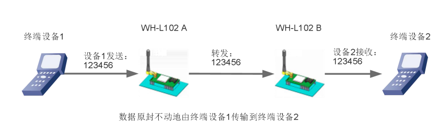 (3)啟動兩個(gè)USR-TCP232-Test(模擬串口設(shè)備1,2)分別連接LoRa數(shù)傳終端A、B的串口,使用串口設(shè)備1發(fā)送數(shù)據(jù)串口設(shè)備2可接收數(shù)據(jù)(反之亦然),通信效果如下圖所示: