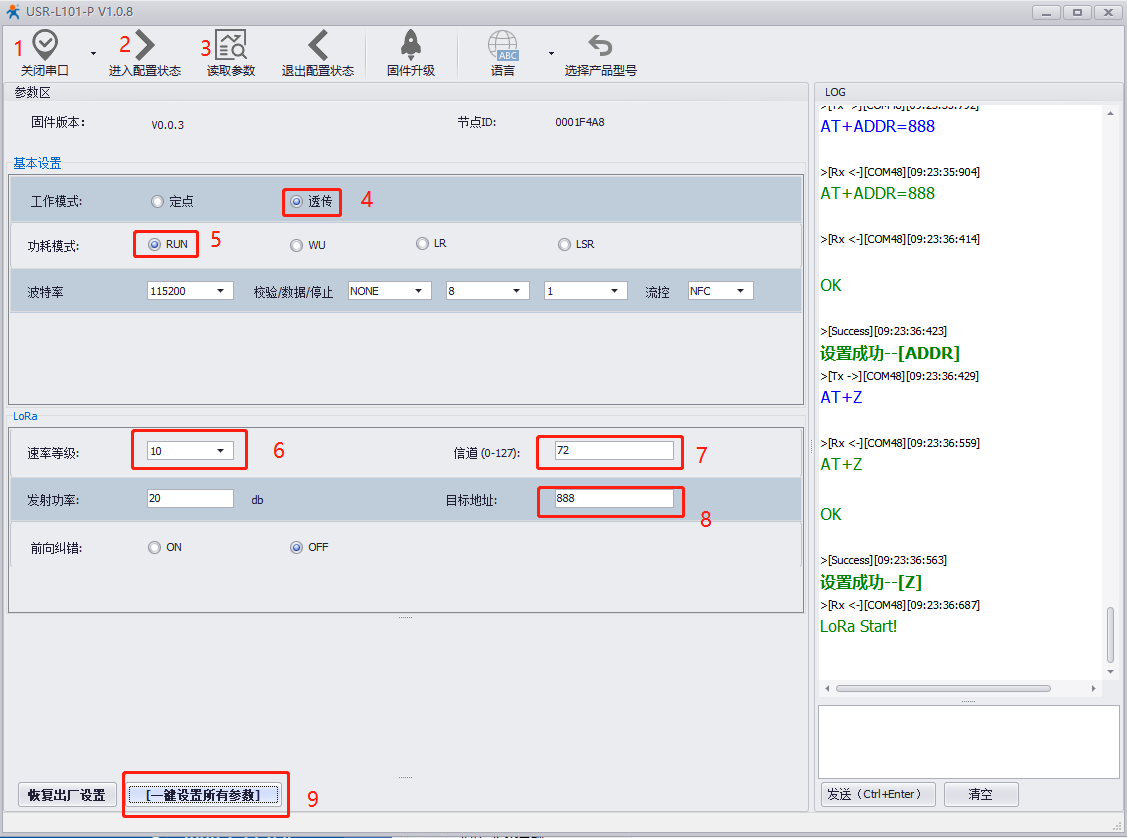 打開LoRa設(shè)置軟件(102-P設(shè)備選擇L101-P打開軟件),依次點(diǎn)擊打開串口(選擇A、B對應(yīng)的串口號,串口參數(shù):115200,None,8,1,NFC)、進(jìn)入配置狀態(tài)、讀取參數(shù)、配置上表中的參數(shù)、一鍵設(shè)置所有參數(shù),關(guān)閉LoRa設(shè)置軟件。