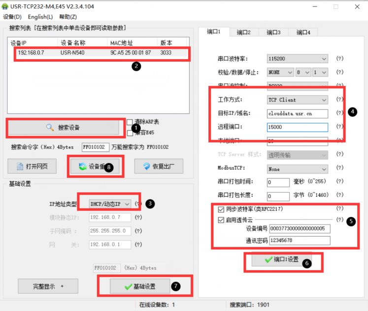 1. 設(shè)置N540參數(shù),將網(wǎng)線與電腦直連,搜索設(shè)備,將ip改為動態(tài),模塊工作方式改為client,目標地址為有人云地址clouddata.usr.cn,端口為15000