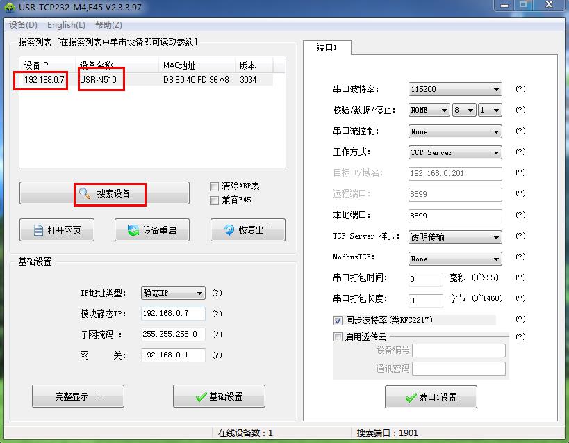 用M4設(shè)置軟件搜索USR-N510的IP。確認是192.168.0.7