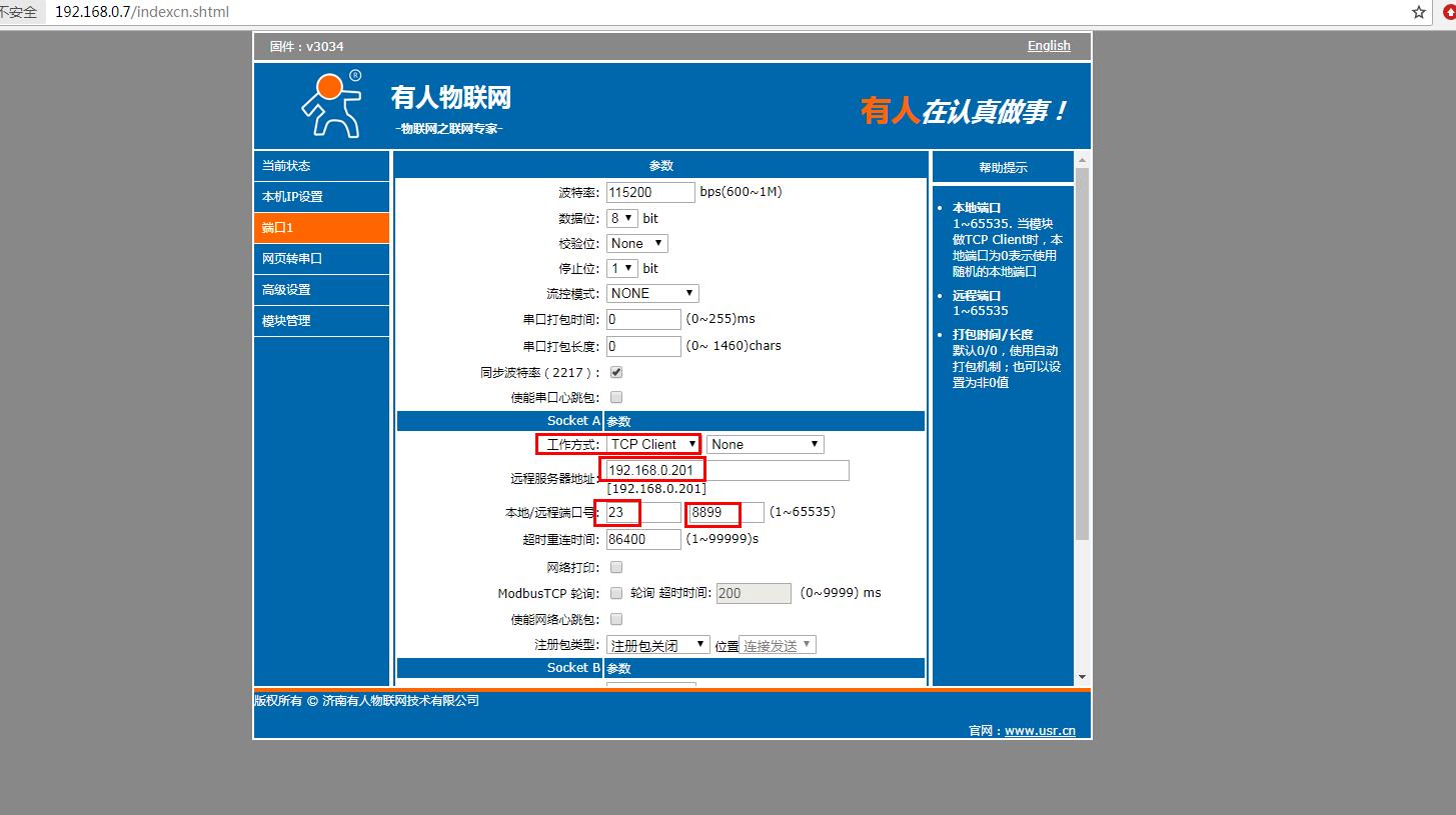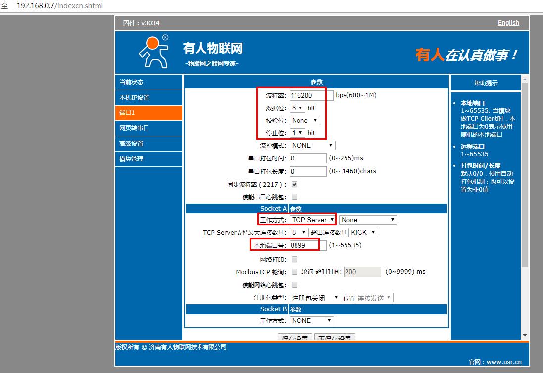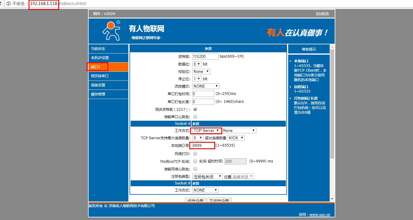 網(wǎng)頁檢查串口參數(shù),工作方式設(shè)置TCP server,本地端口號默認是8899