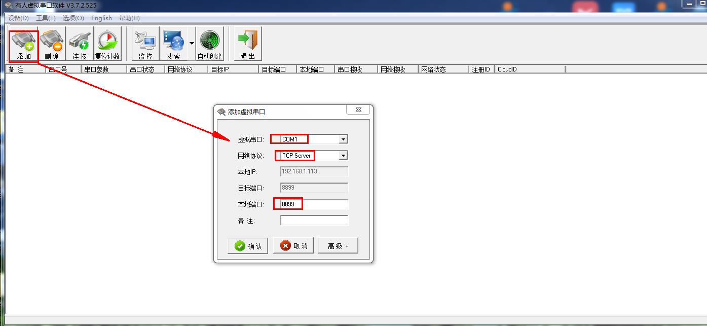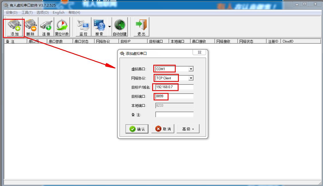 虛擬串口軟件手動添加一個COM1,網(wǎng)絡(luò)協(xié)議設(shè)置TCP client,目標IP填192.168.0.7,目標端口填8899。