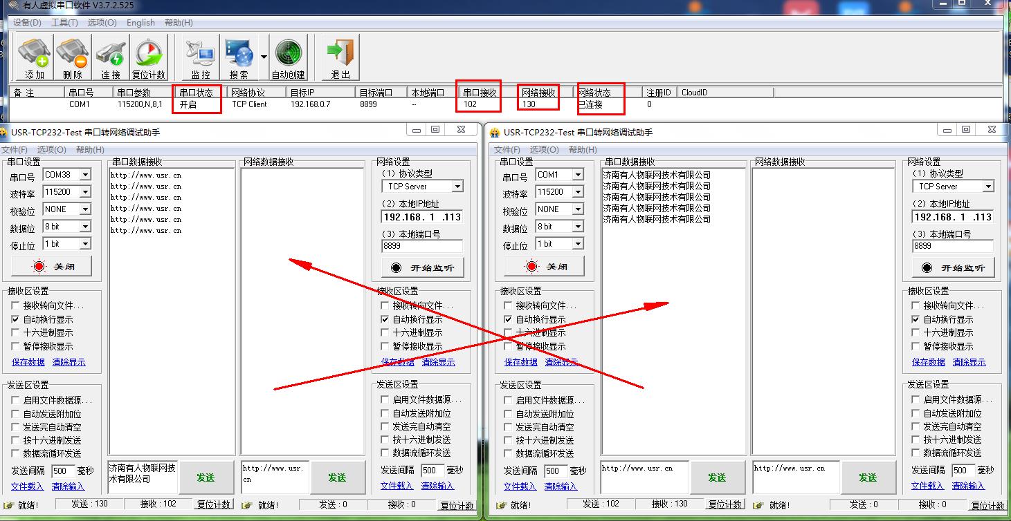 在電腦上,打開2個串口助手,USR-TCP232-TEST軟件。
