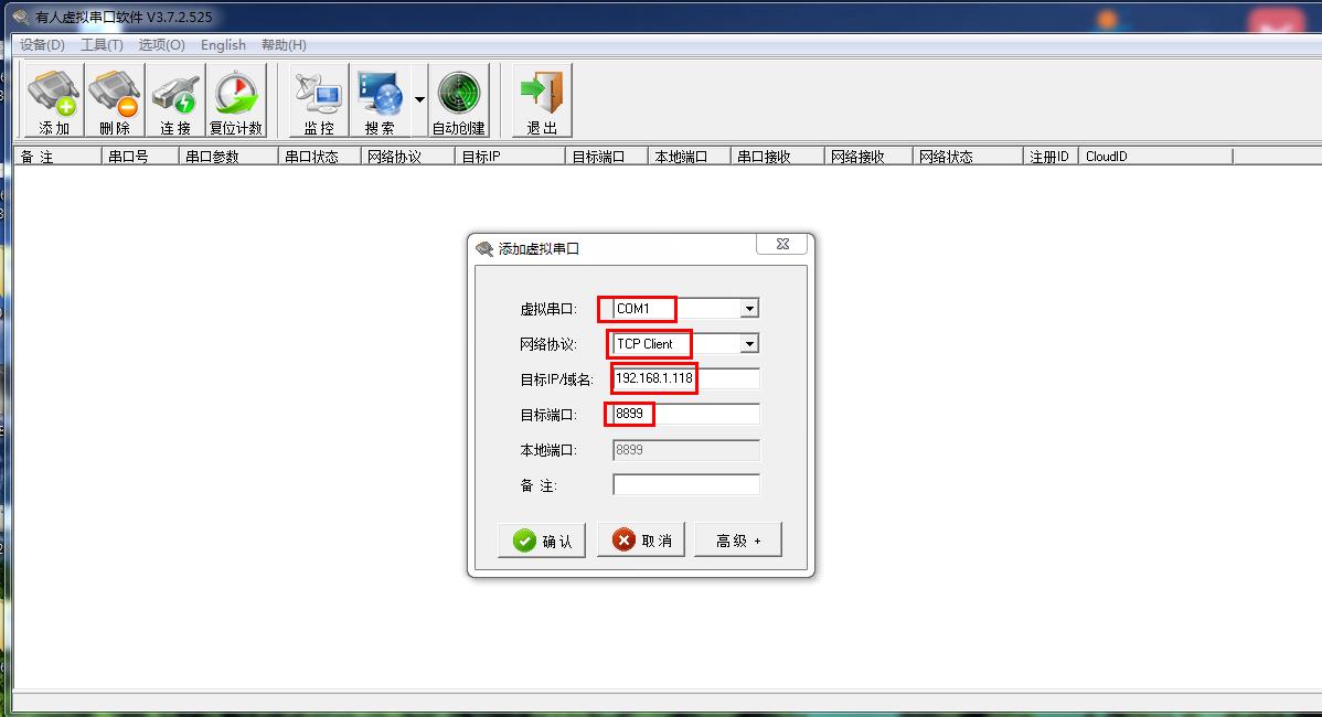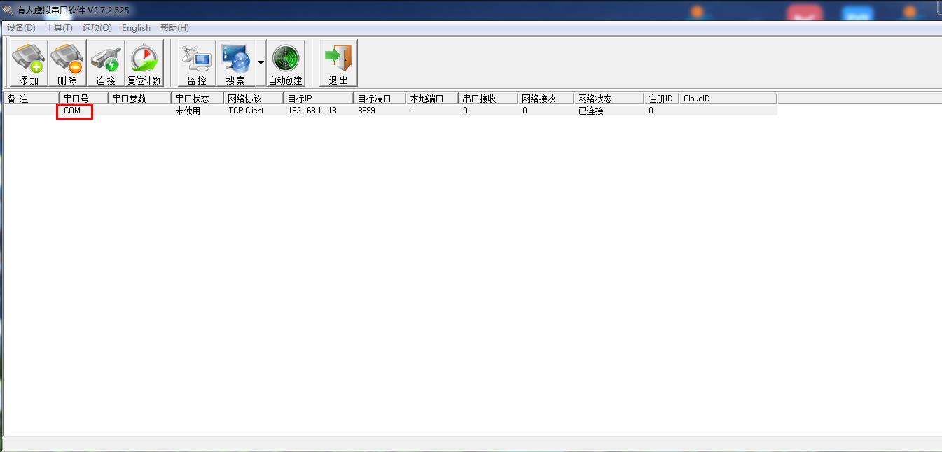 虛擬串口軟件手動添加一個COM1,網(wǎng)絡(luò)協(xié)議設(shè)置TCP client,目標IP填192.168.1.118,目標端口填8899。