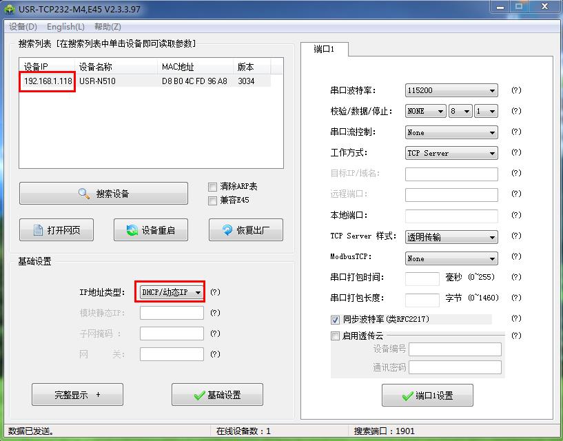 用M4設(shè)置軟件搜索USR-N510的IP 192.168.1.118