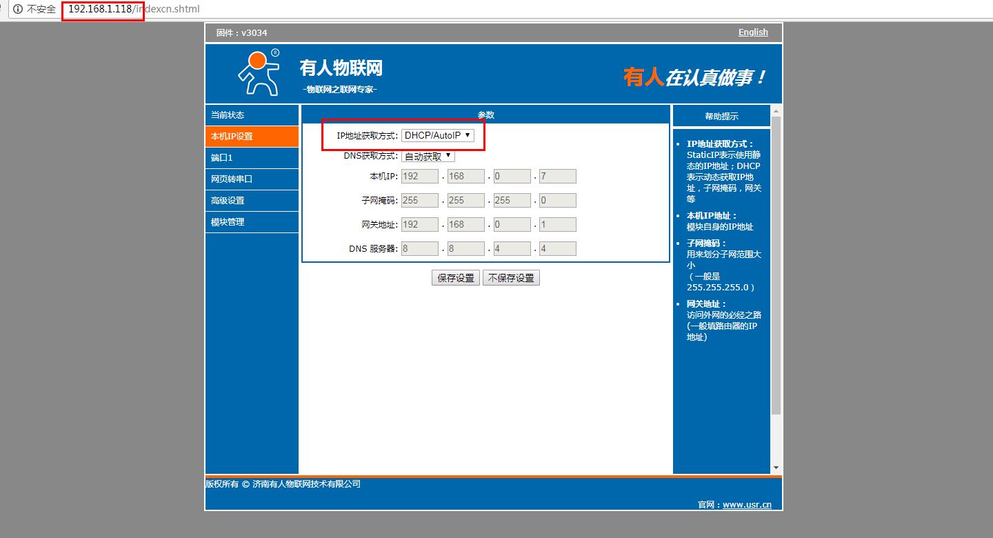 在電腦打開瀏覽器,輸入靜態(tài)IP192.168.1.118 登錄USR-N510的內(nèi)置網(wǎng)頁。