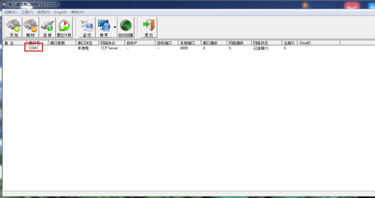 虛擬串口軟件手動添加一個COM1,網(wǎng)絡(luò)協(xié)議設(shè)置TCP server,本地端口填8899。