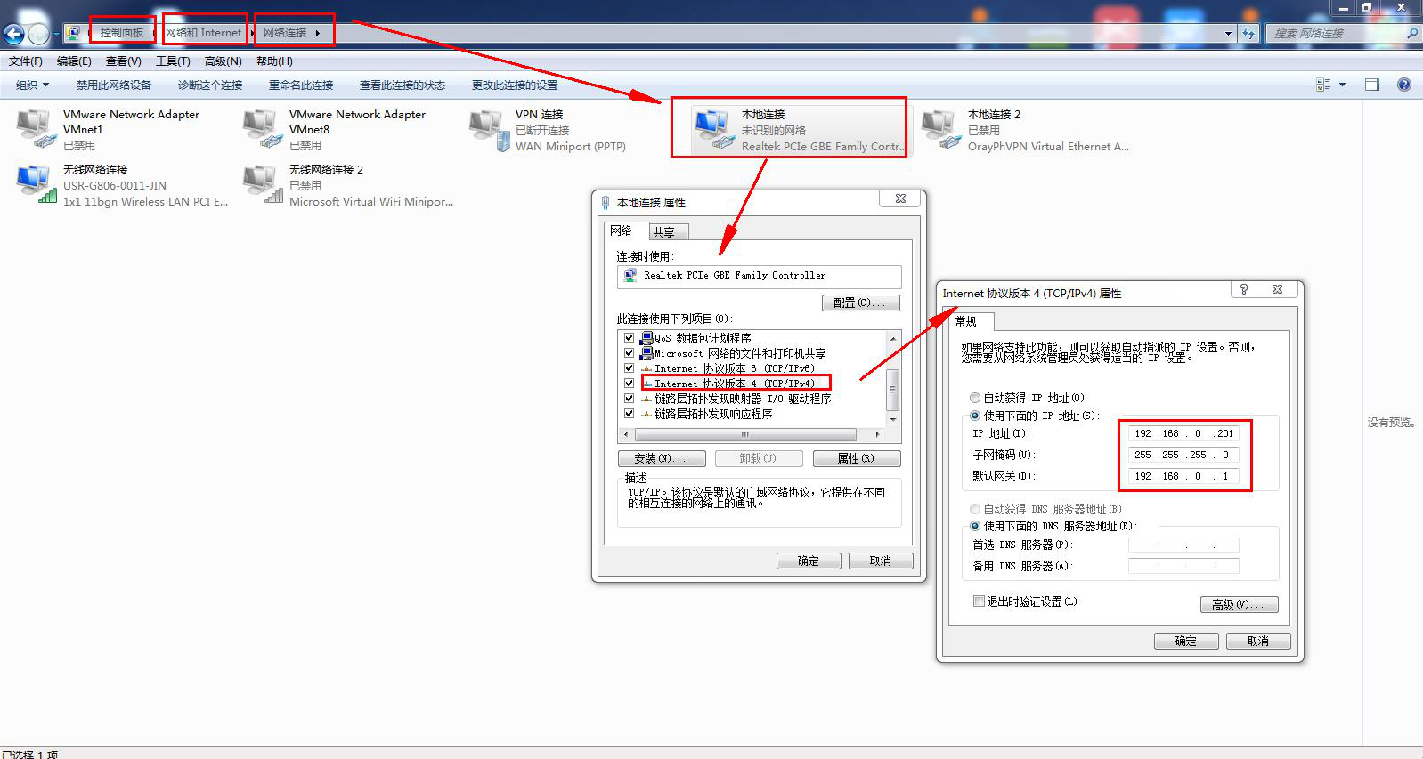 USR-TCP232-304網(wǎng)口用網(wǎng)線連接電腦網(wǎng)口,電腦IP和USR-TCP232-304的IP設(shè)置同一網(wǎng)段。USR-TCP232-304默認(rèn)IP是192.168.0.7。因此電腦設(shè)置靜態(tài)IP,192.168.0.201,子網(wǎng)掩碼 255.255.255.0,網(wǎng)關(guān)192.168.1.1。