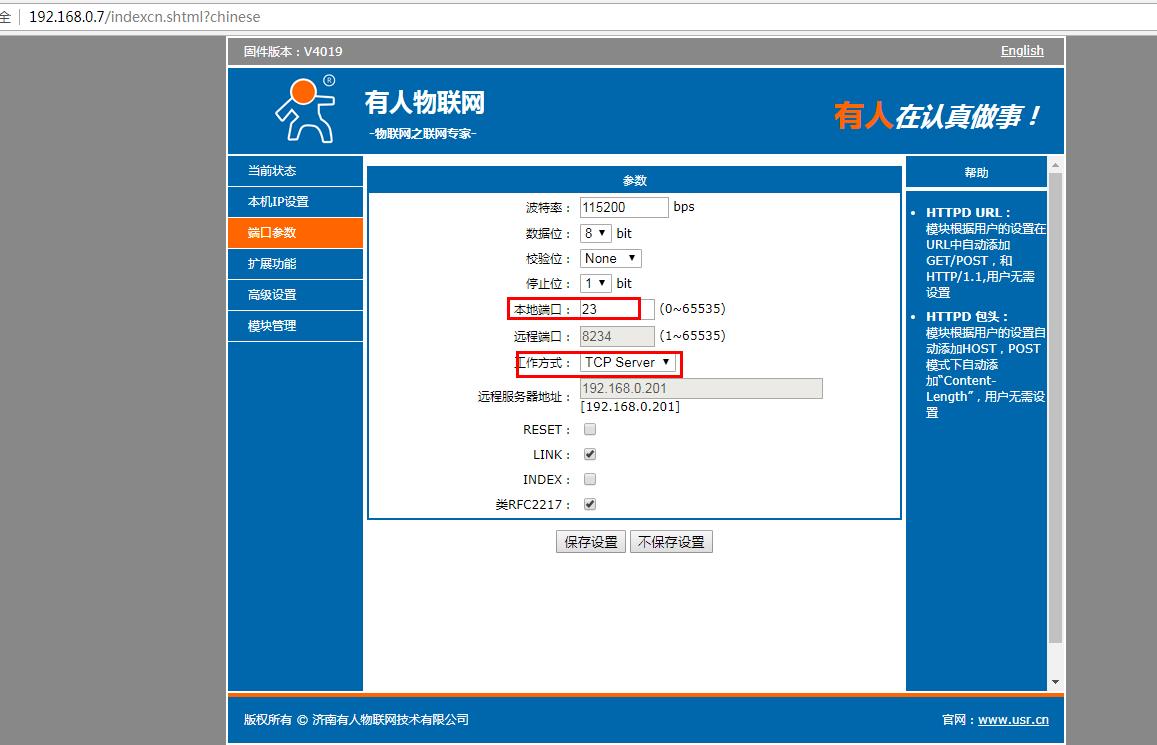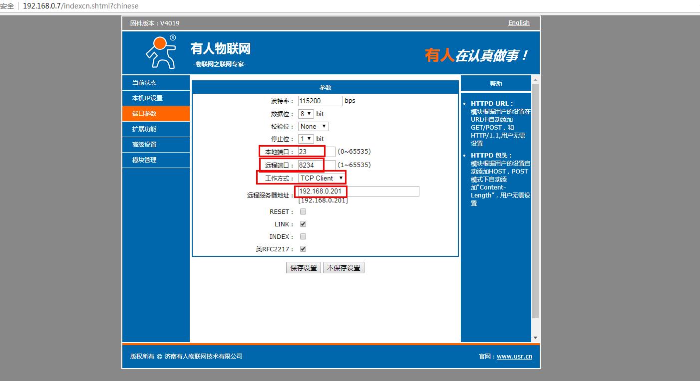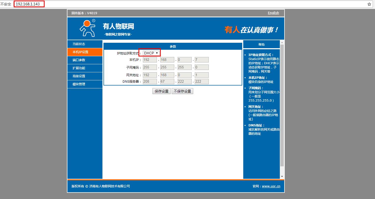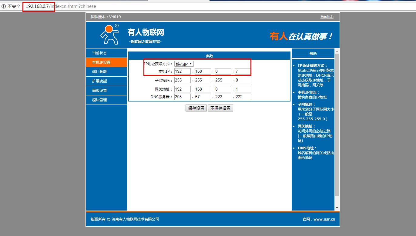 在電腦打開瀏覽器,輸入靜態(tài)IP192.168.0.7 登錄USR-TCP232-304的內(nèi)置網(wǎng)頁。