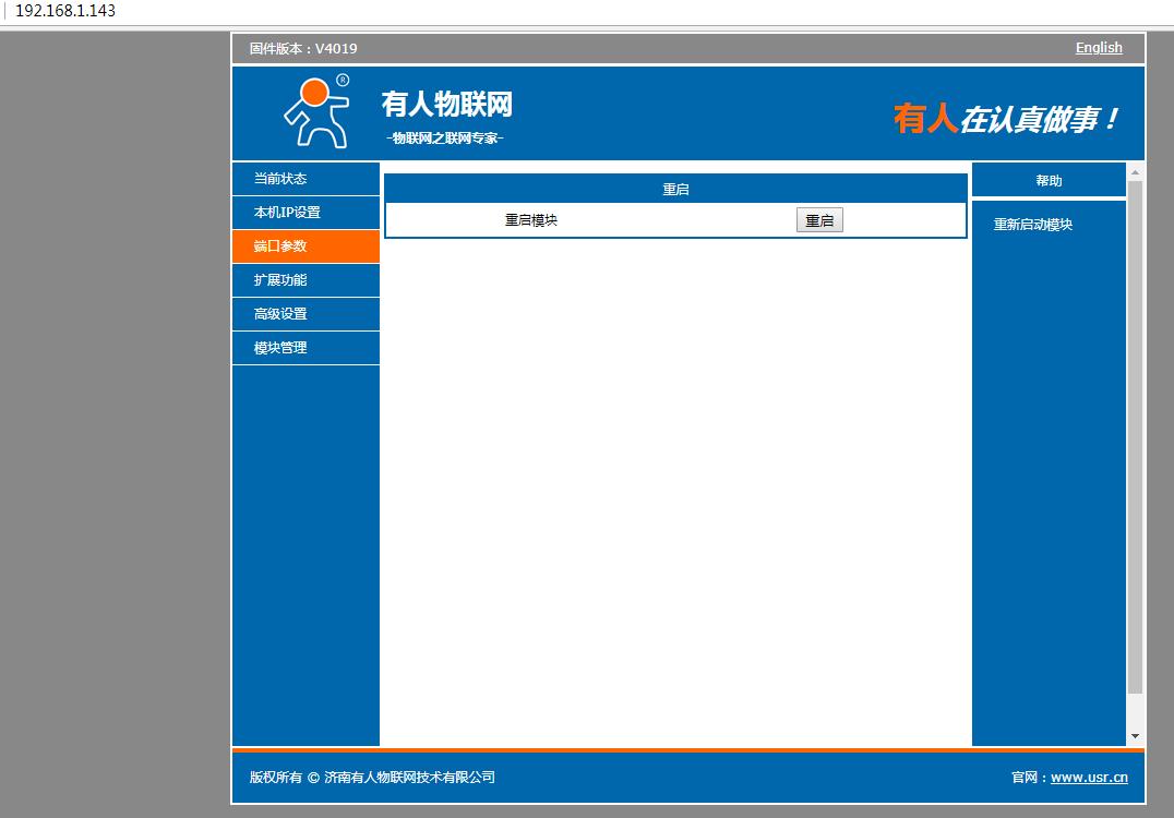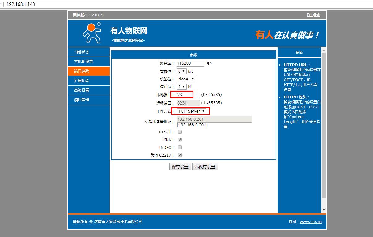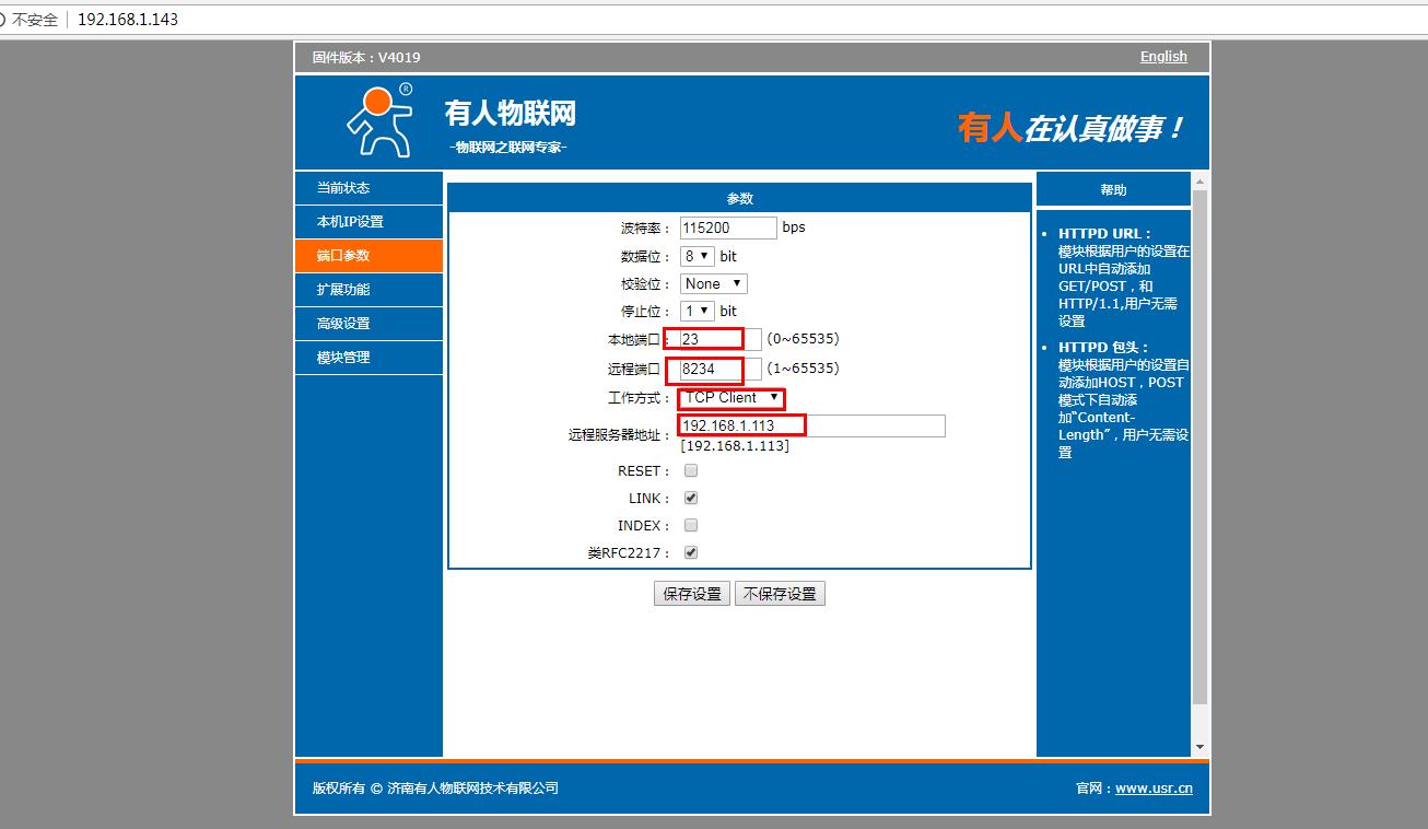 在電腦打開瀏覽器,輸入靜態(tài)IP192.168.1.143 登錄USR-TCP232-304的內(nèi)置網(wǎng)頁。
