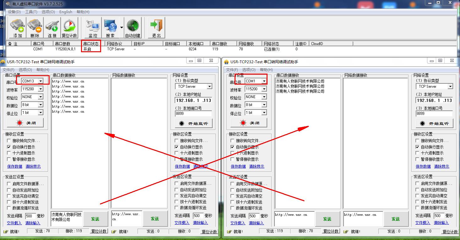 分別打開USR-TCP232-304實(shí)際串口COM13,虛擬串口COM1。