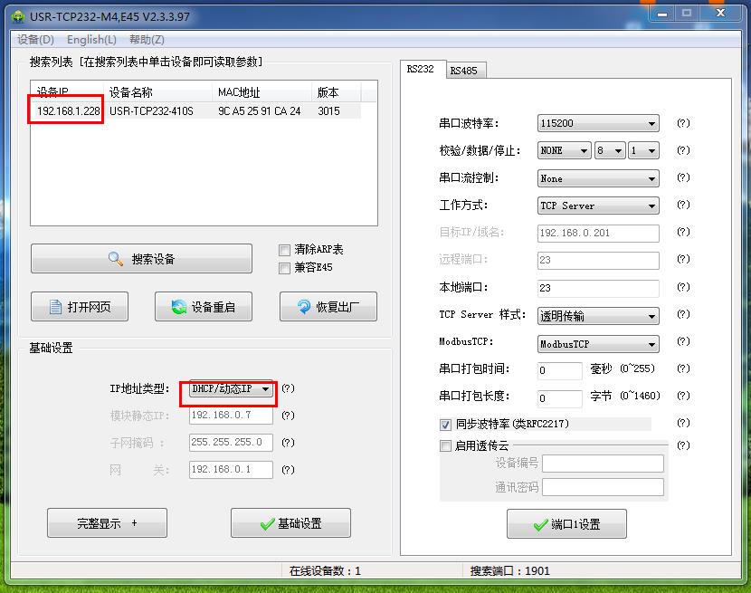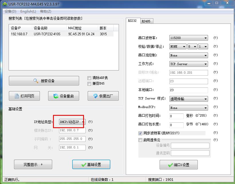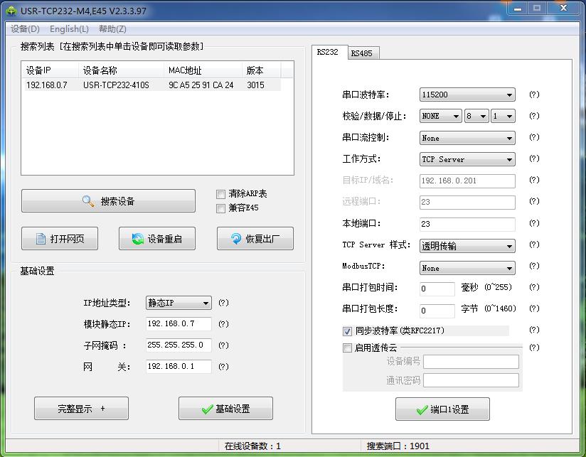 用M4設(shè)置軟件搜索USR-TCP232-410S的IP。確認(rèn)是192.168.0.7