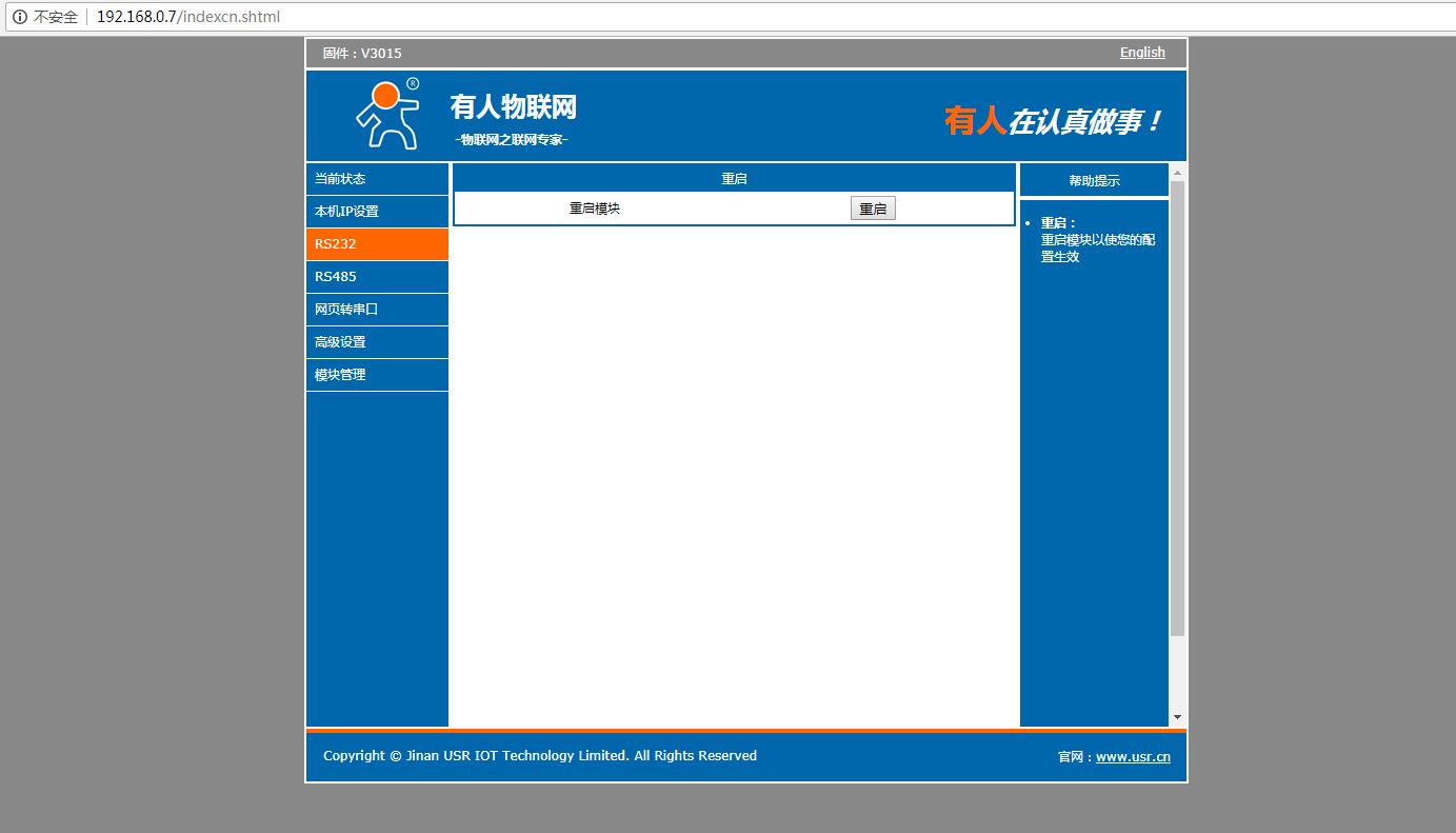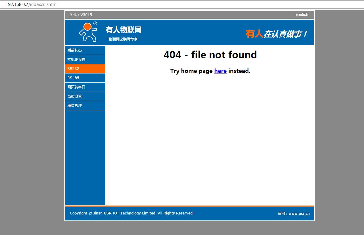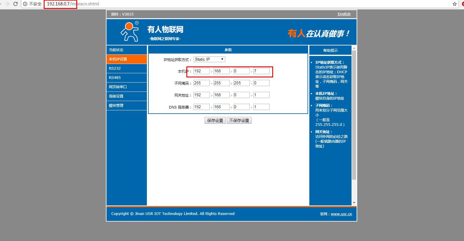 在電腦打開瀏覽器,輸入靜態(tài)IP192.168.0.7 登錄USR-TCP232-410S的內(nèi)置網(wǎng)頁(yè)。
