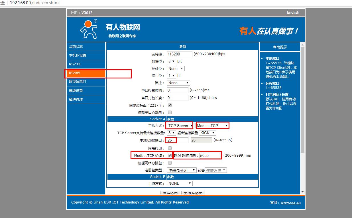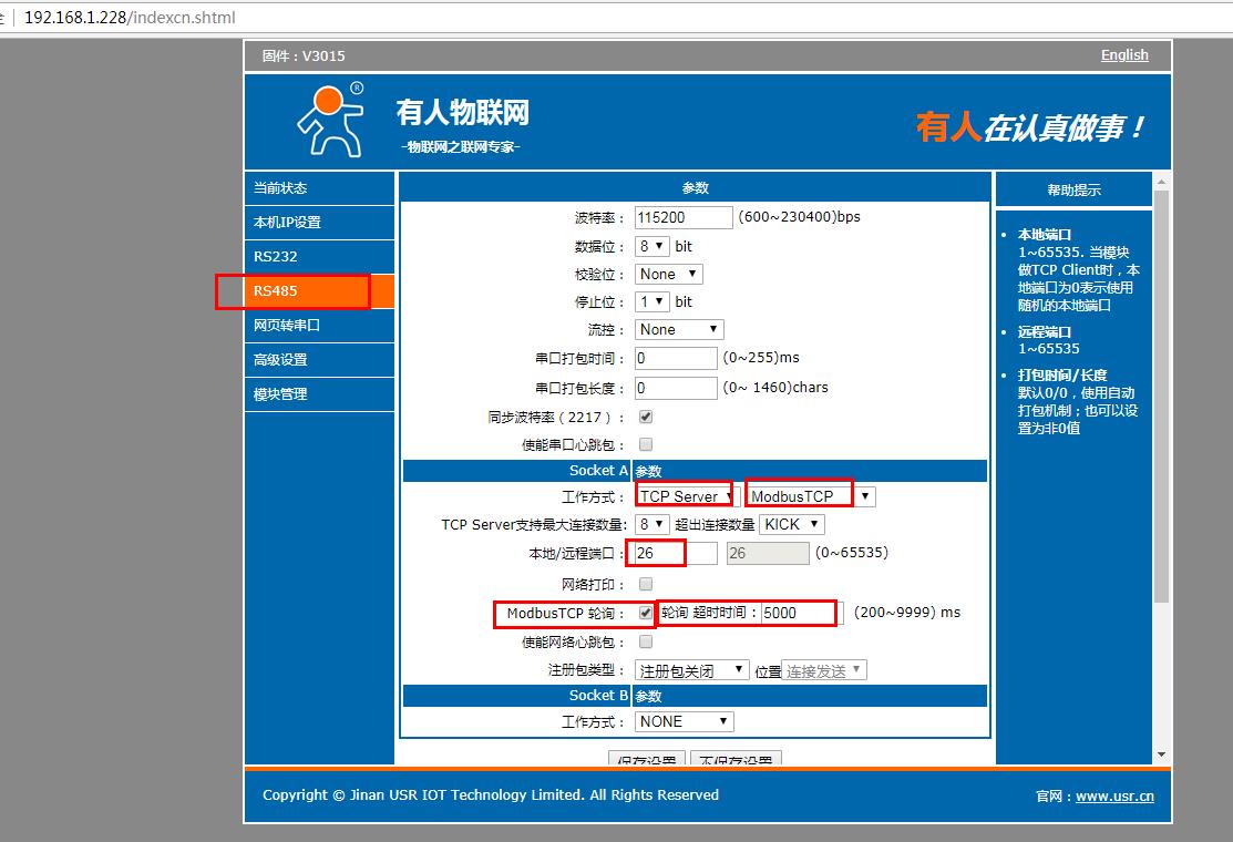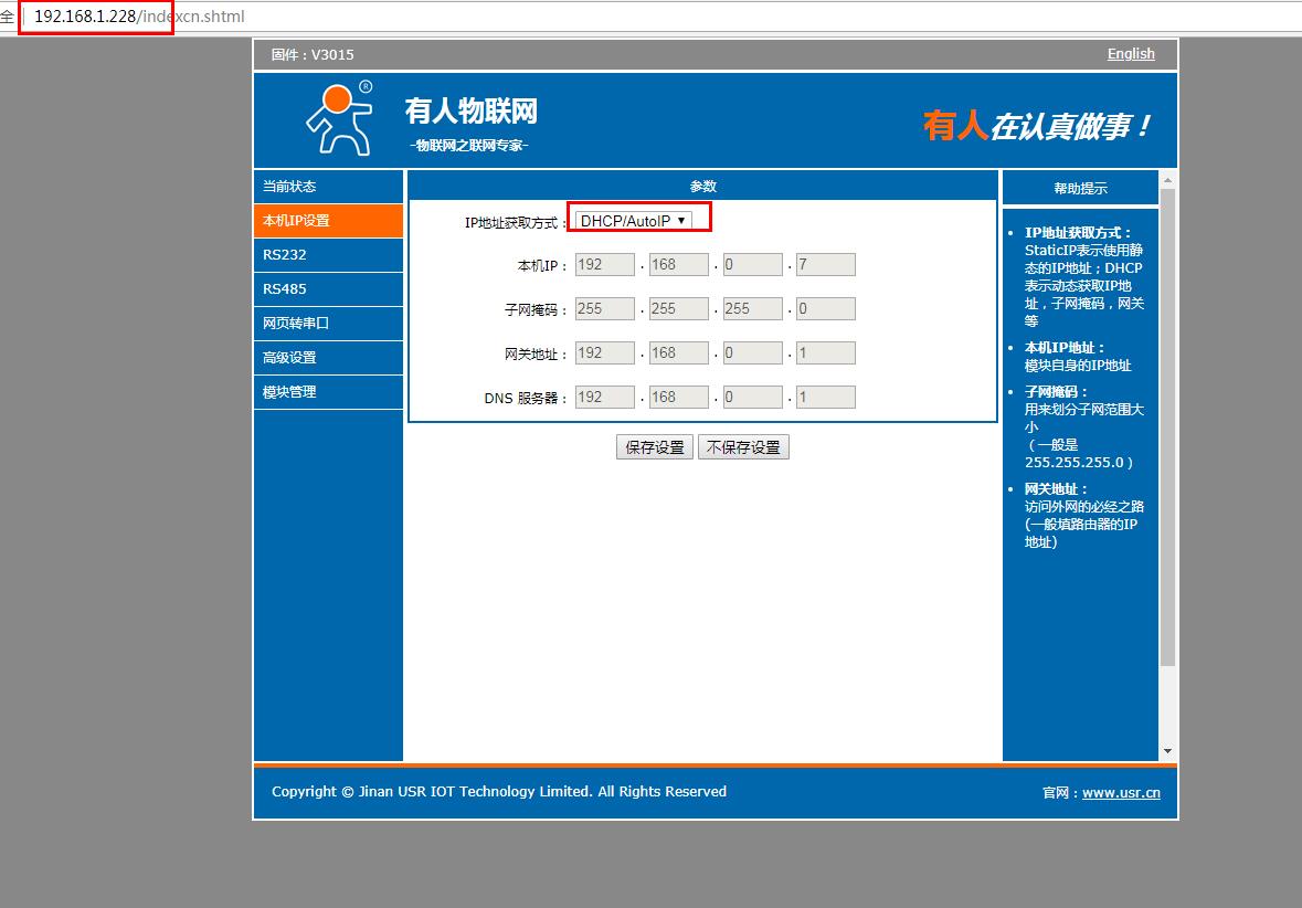 三、DHCP動(dòng)態(tài)獲取IP時(shí),USR-TCP232-410S設(shè)置MODBUS網(wǎng)關(guān):