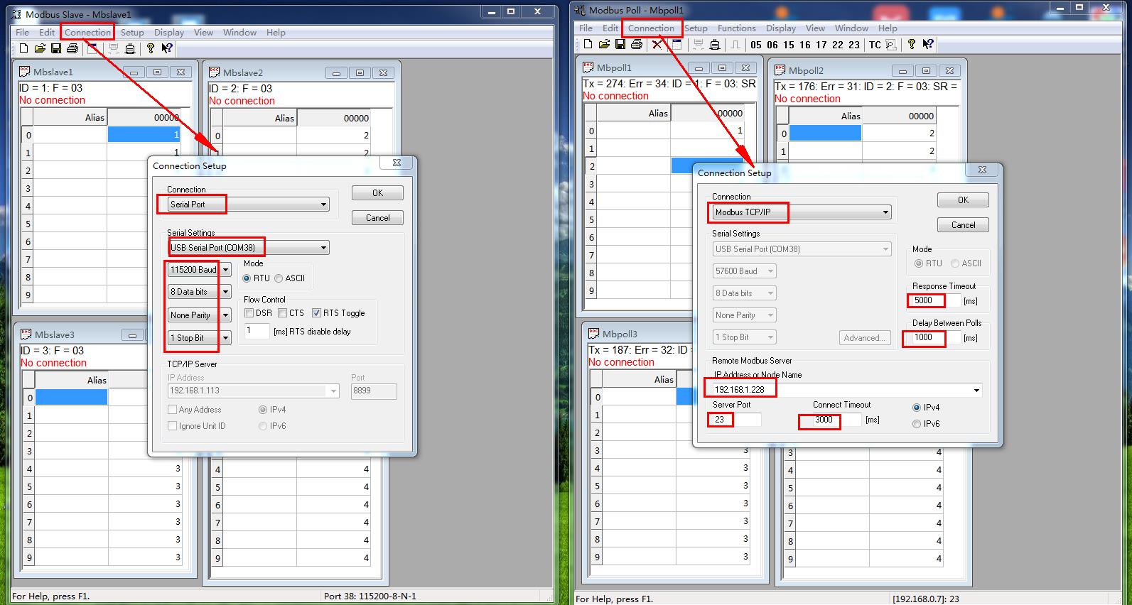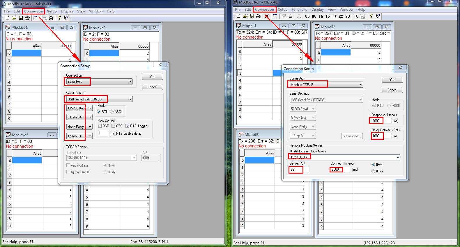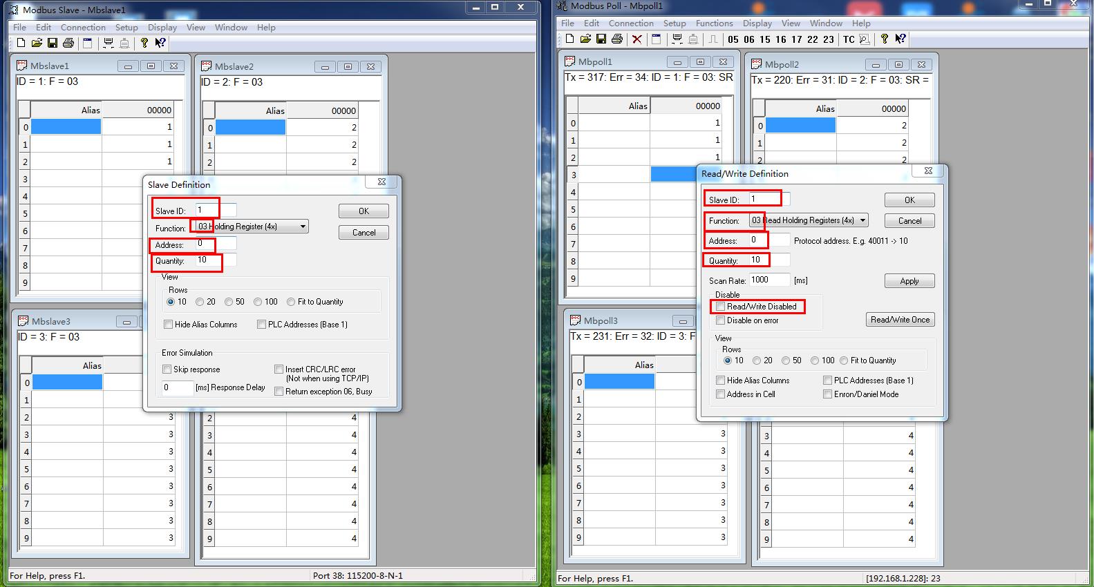 模擬測(cè)試用MODBUS SLAVE軟件做串口設(shè)備,用MODBUS POLL軟件做網(wǎng)絡(luò)端。