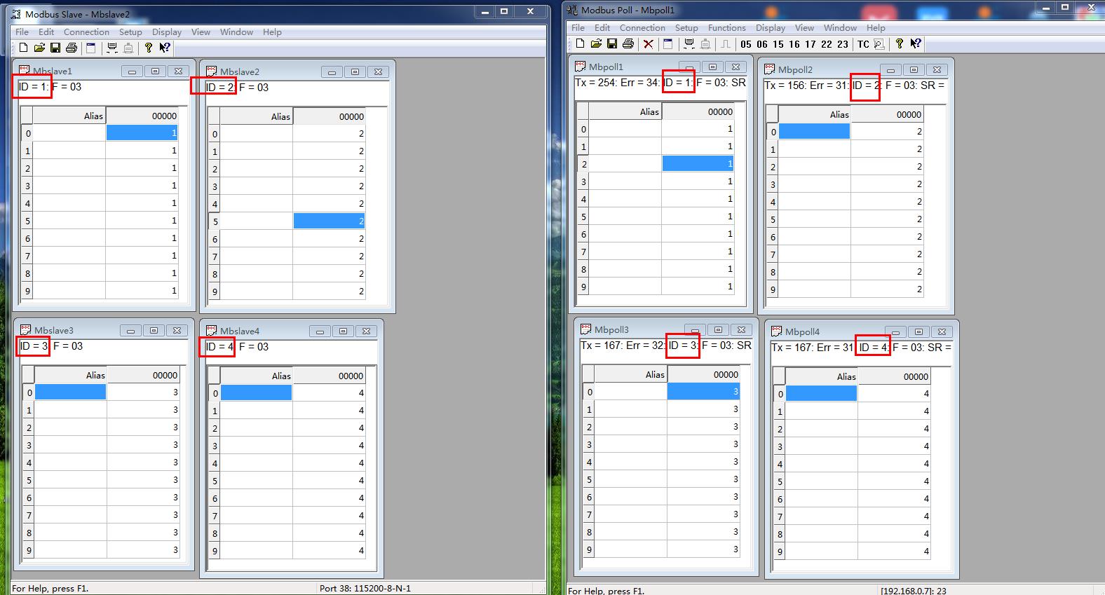 改變每個(gè)MODBUS SLAVE軟件的數(shù)據(jù),對(duì)應(yīng)的MODBUS POLL軟件就可以采集到正確的數(shù)據(jù)。
