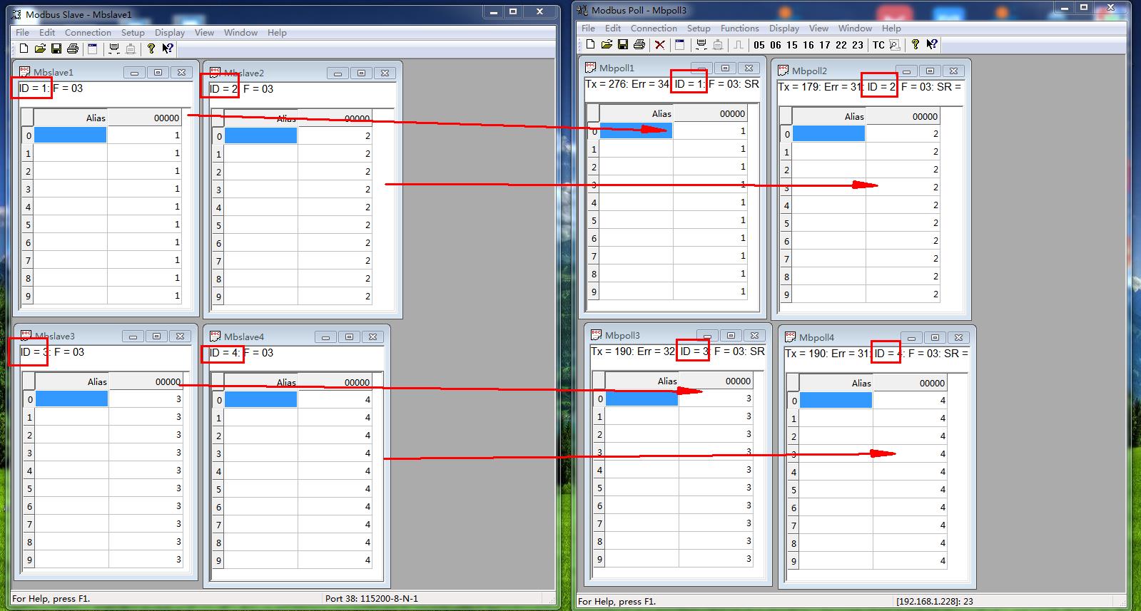MODBUS POLL軟件對(duì)應(yīng)添加4個(gè)SLAVE ID,依次是ID 1 ID 2 ID 3 ID 4。
