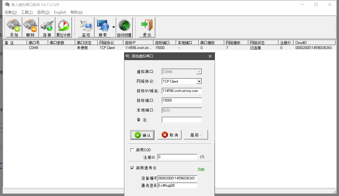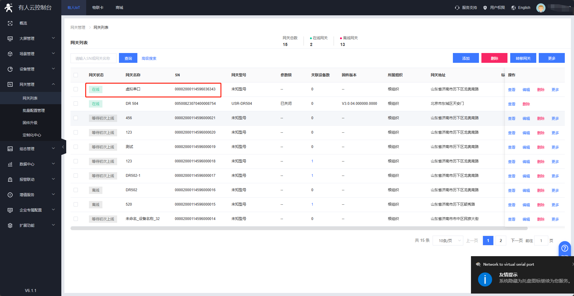 3、此時(shí)可以看到有人云平臺(tái)上虛擬串口上線