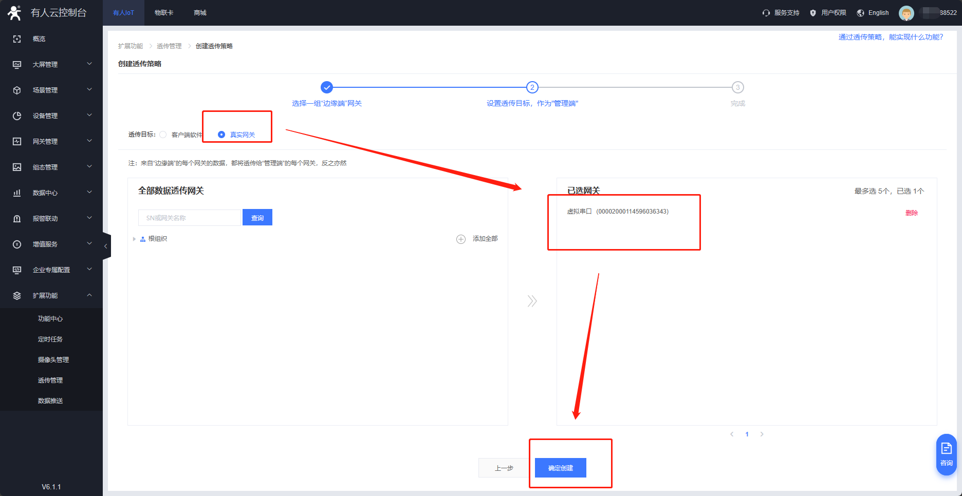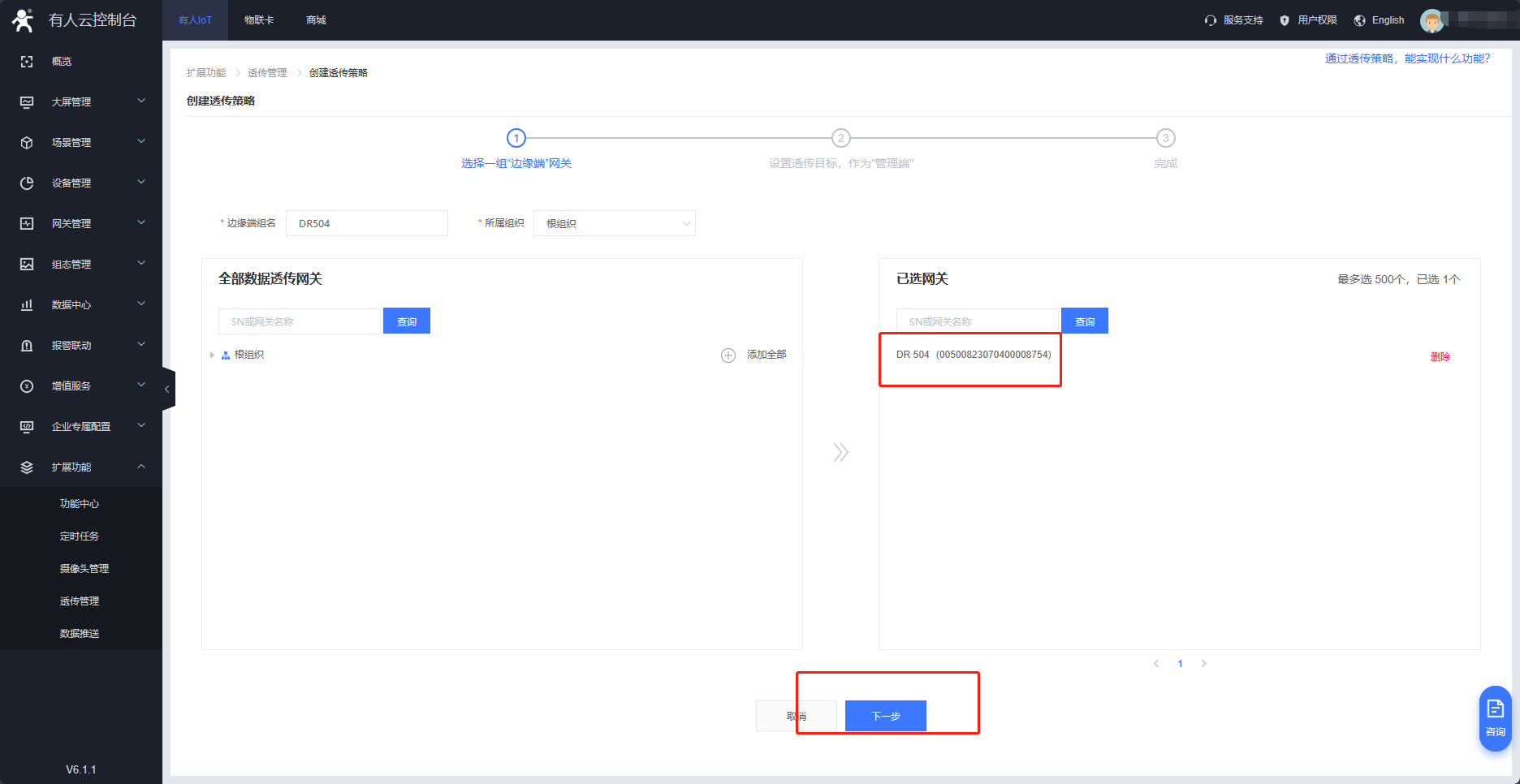 七、有人云平臺(tái)創(chuàng)建透?jìng)鞑呗?br />1、登錄有人云平臺(tái),在擴(kuò)展功能的界面開(kāi)啟透?jìng)鞴芾?。?chuàng)建透?jìng)鞑呗?br />2、選擇邊緣端設(shè)備(DR504)點(diǎn)擊下一步