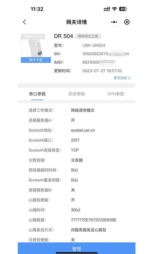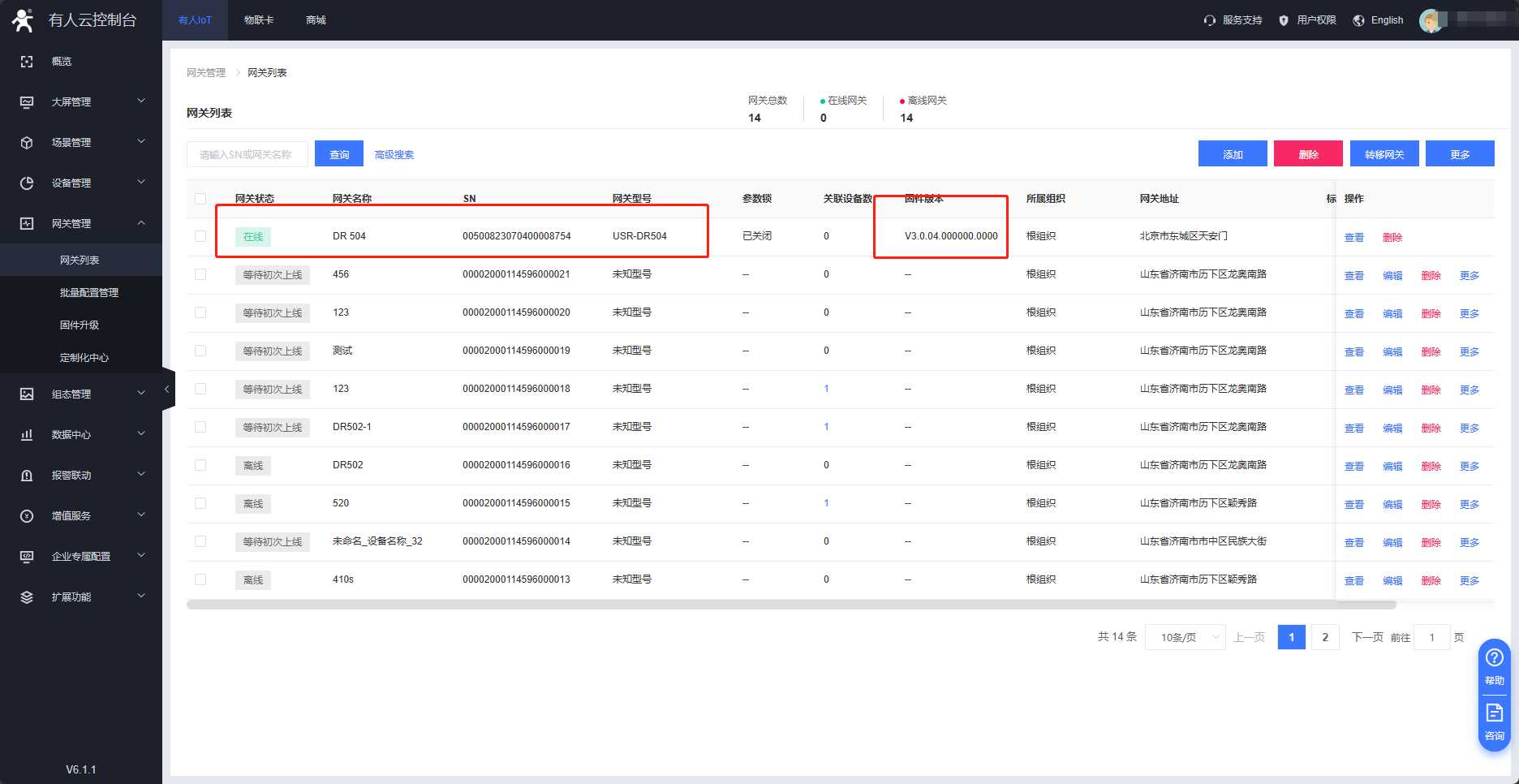 在網(wǎng)關(guān)管理---網(wǎng)關(guān)列表可以看到我們掃碼添加的DR504設(shè)備,如果設(shè)備目前處于離線狀態(tài),可以檢查一下設(shè)備自身是否可以正常聯(lián)網(wǎng)。在設(shè)備正常聯(lián)網(wǎng)狀態(tài)下可以重啟下設(shè)備,可以看到設(shè)備的在線信息。
