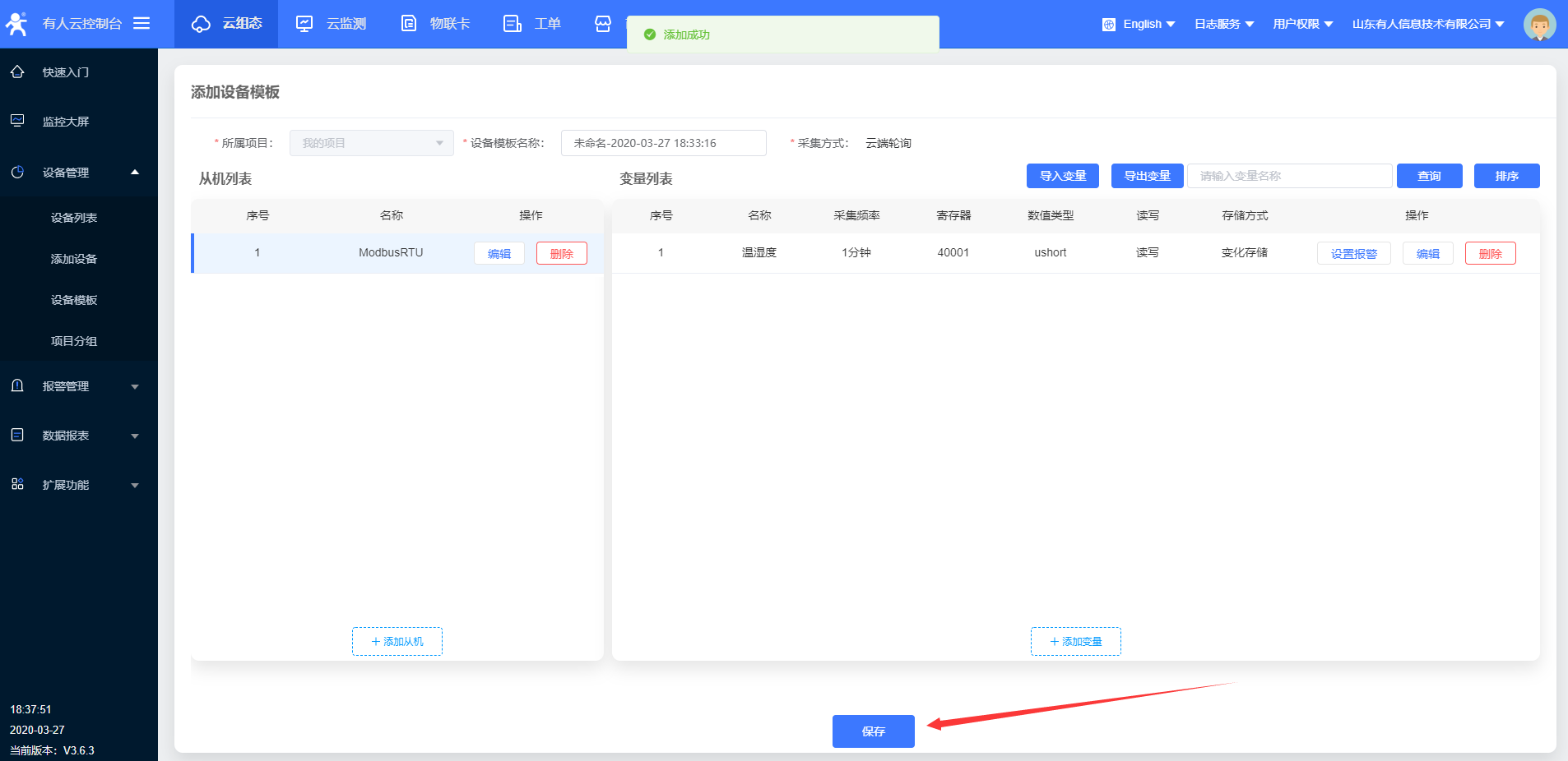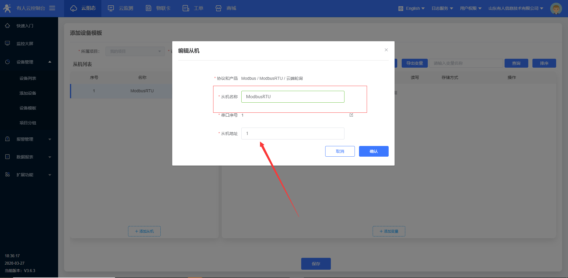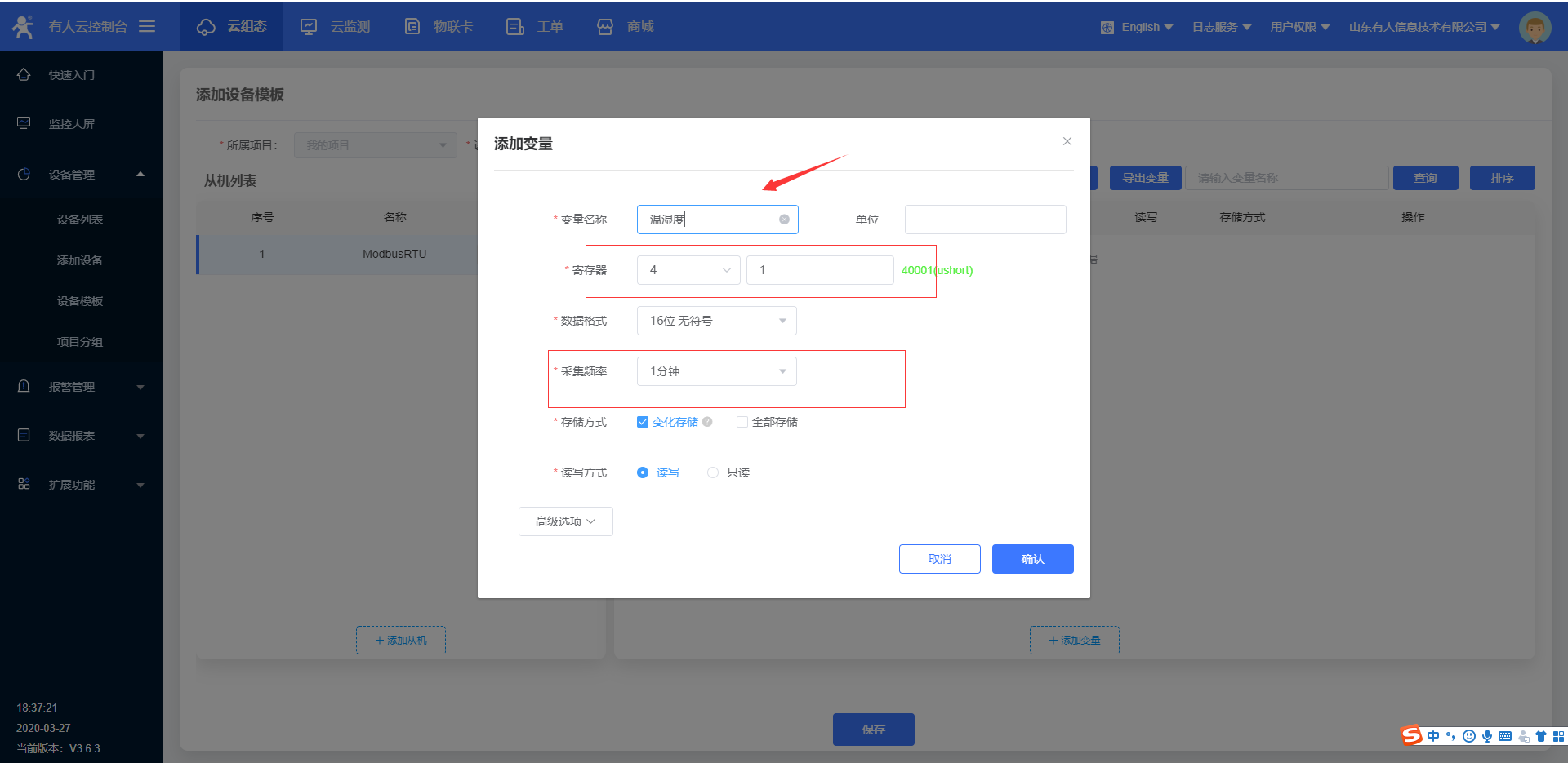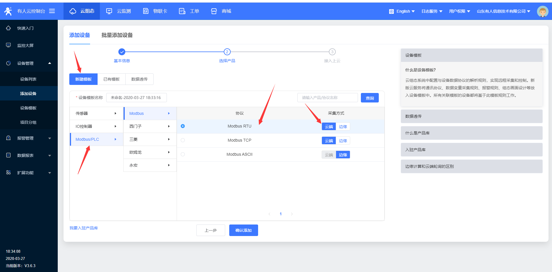 4.進入云組態(tài),選擇添加設備,W600目前只能使用ID方式添加設備id;設備id和密碼設置默認就可以,點擊下一步,添加數(shù)據(jù)模,模板更改名稱,選擇modbus rtu云端采集,確認添加。