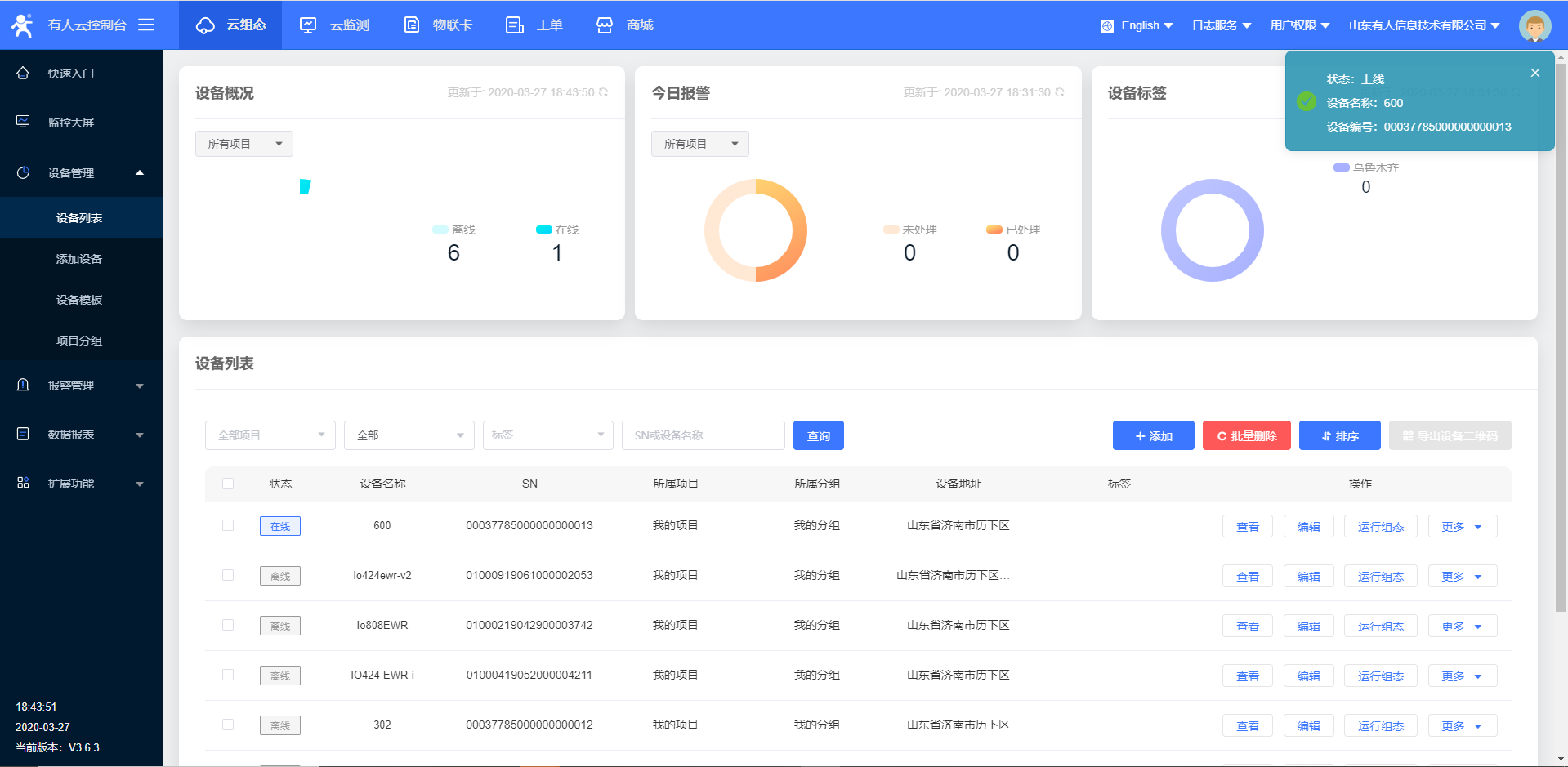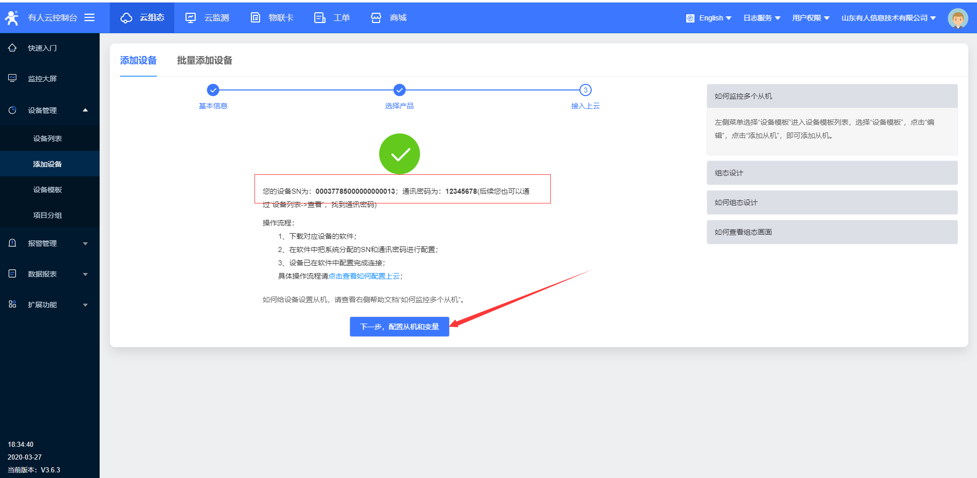 10.設置完所有的參數(shù)要 重啟設備,稍等一會,在有人云界面,您會看到有人云已經(jīng)上線