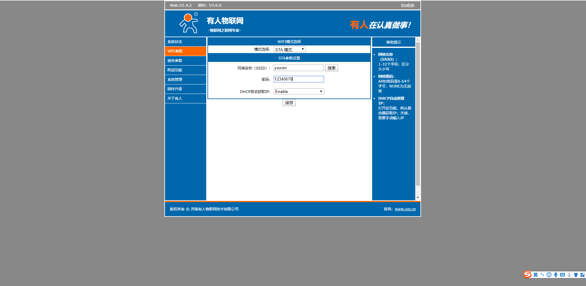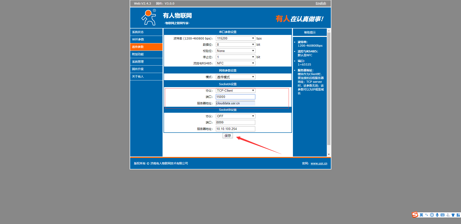 8.在透傳參數(shù),設置串口參數(shù)設置為和您終端設備的串口參數(shù)一致。做tcp client,遠程服務器為clouddata.usr.cn,遠程端口15000,,點擊保存