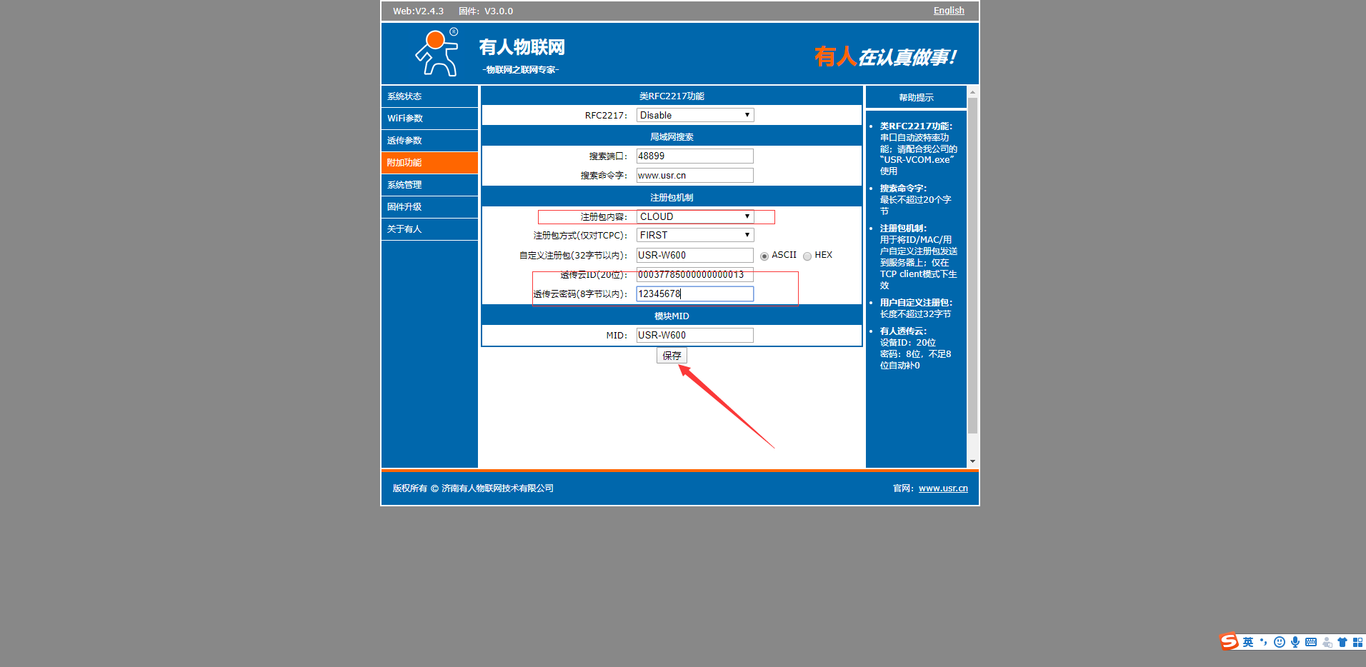 9.在附加功能,注冊包選擇透傳云,填上有人云上新建立的設備id,和密碼(如下圖所示)