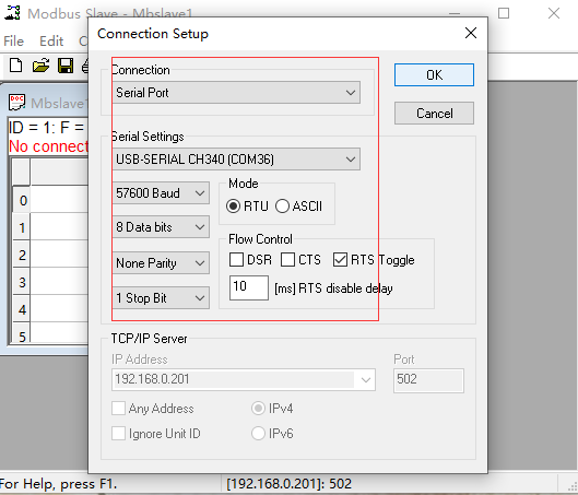 11、打開modbus軟件,點擊連接。選擇串口com36(w630的串口用usb轉(zhuǎn)485接到電腦上的),串口參數(shù)要和w600一致。