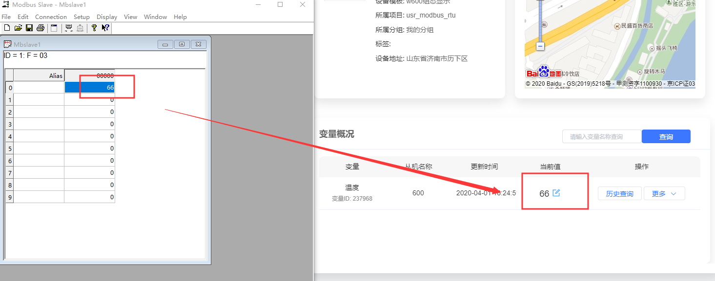12、在modbus slave串口軟件發(fā)送數(shù)值,可以在有人云上進行數(shù)據(jù)的顯示,其中ID1是從機號,03是功能碼