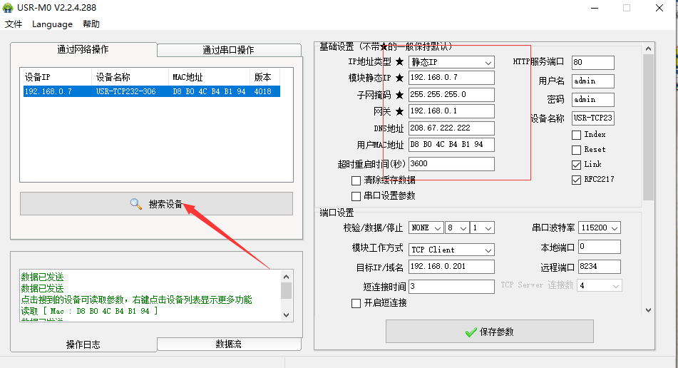 3. 打開M0設(shè)置軟件,點(diǎn)擊搜索設(shè)備,可看到搜索到的設(shè)備,點(diǎn)擊選中,可看到IP地址類型為靜態(tài)IP