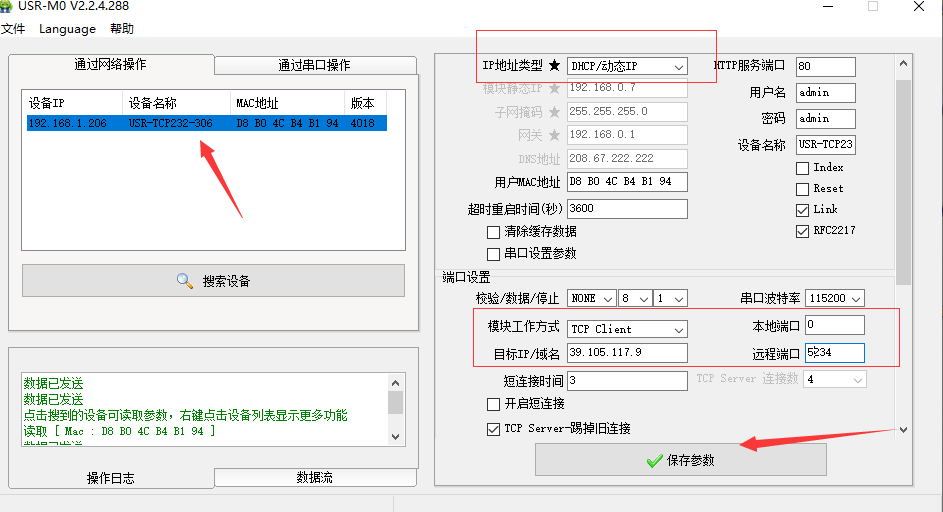4. IP地址類型更改為DHCP/動(dòng)態(tài)IP,工作方式選擇TCP Client,目標(biāo)IP:39.105.117.9(客戶想要連接的服務(wù)器的IP地址),遠(yuǎn)程端口號(hào):5234,設(shè)置完成后點(diǎn)擊保存參數(shù)。