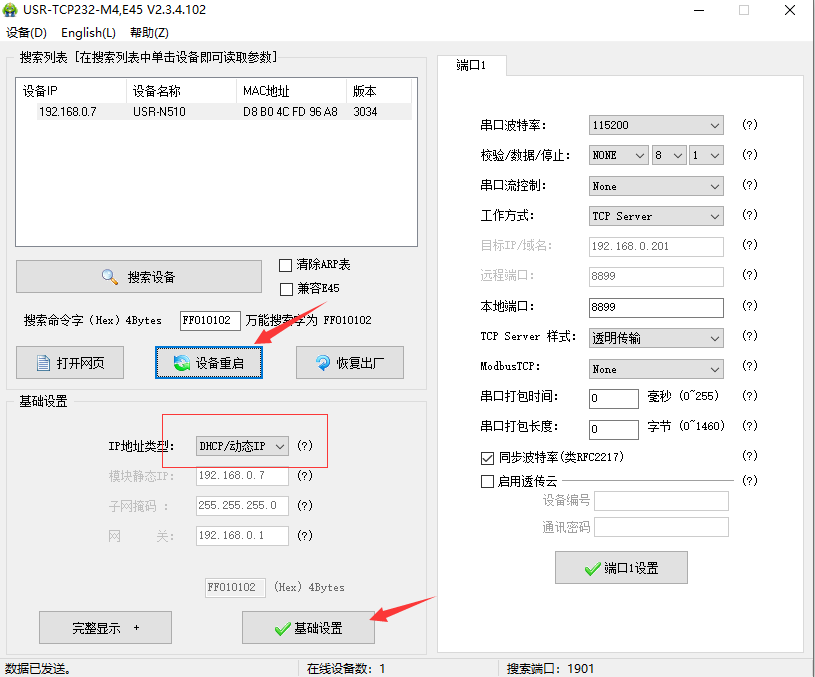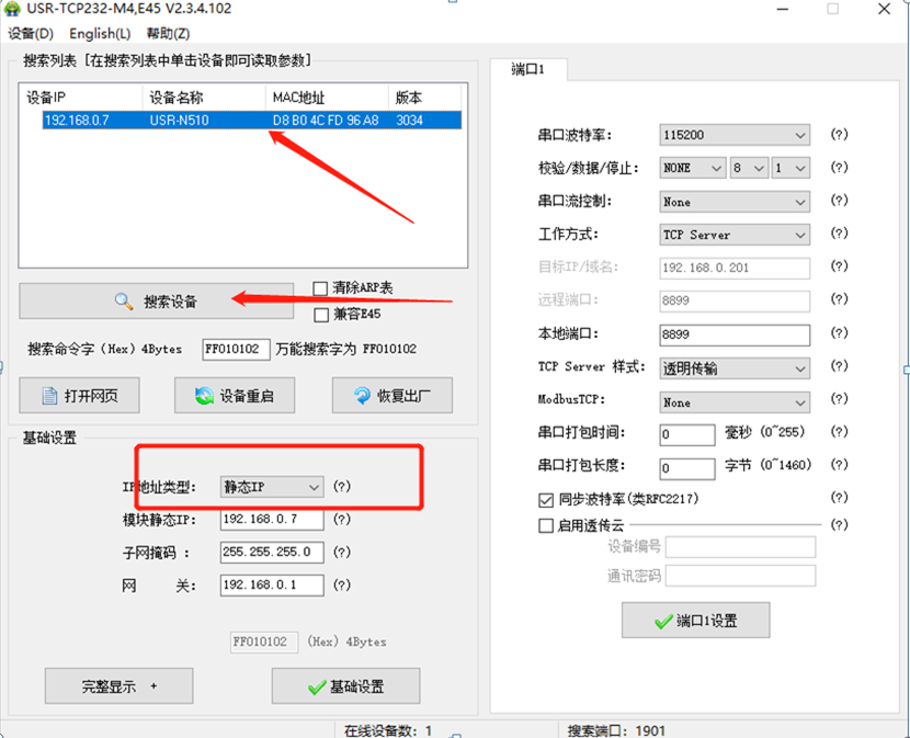 3. 打開M4設(shè)置軟件,點(diǎn)擊搜索設(shè)備,可看到搜索到的設(shè)備,點(diǎn)擊選中,可看到IP地址類型為靜態(tài)IP。
