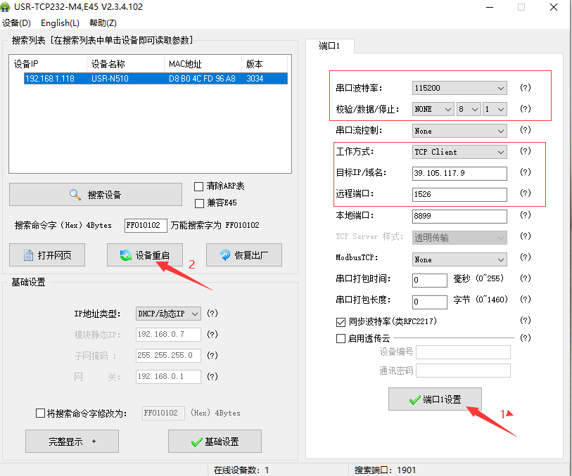 6. 工作方式選擇TCP Client,目標(biāo)IP:39.105.117.9(客戶想要連接的服務(wù)器的IP地址),遠(yuǎn)程端口號(hào):1526(根據(jù)客戶的服務(wù)器地址填寫),設(shè)置完成后點(diǎn)擊端口1設(shè)置保存參數(shù),設(shè)備重啟使參數(shù)生效。