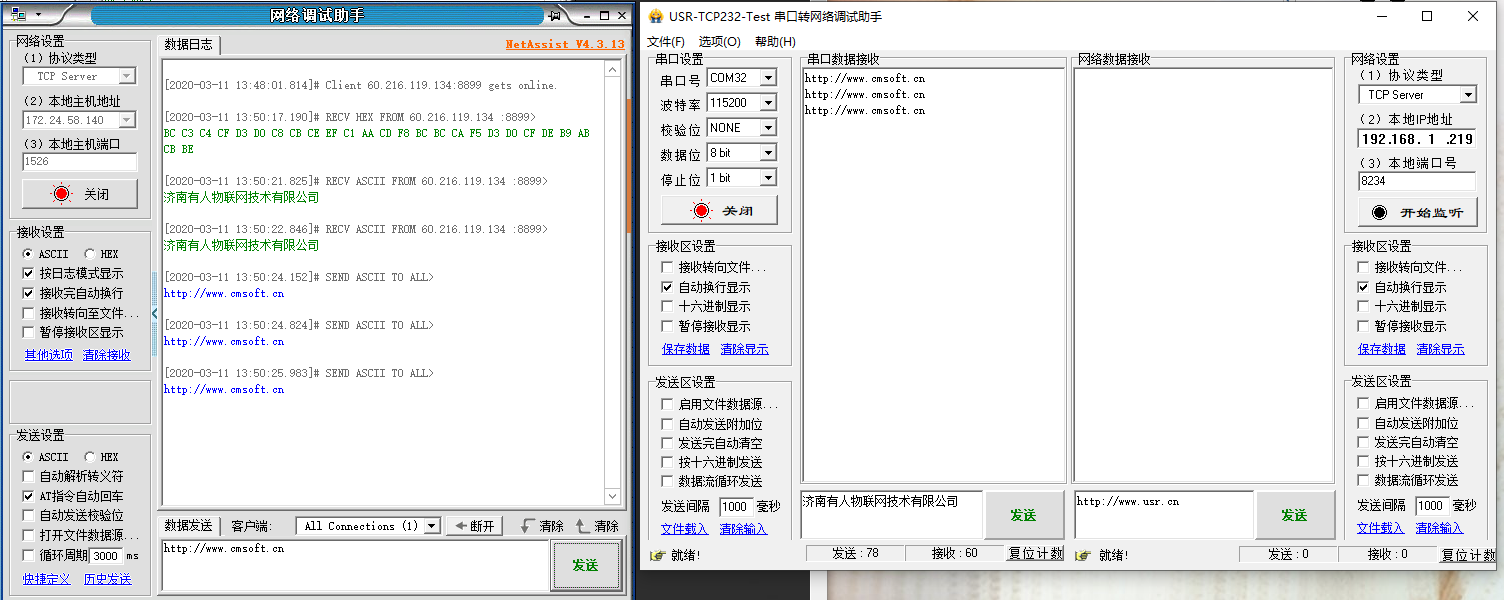 7.打開串口,串口參數(shù)和N510的串口參數(shù)保持一致,網(wǎng)絡(luò)端點(diǎn)擊鏈接,如下圖有連接對(duì)象顯示,網(wǎng)絡(luò)端和串口端互發(fā)數(shù)據(jù)測(cè)試