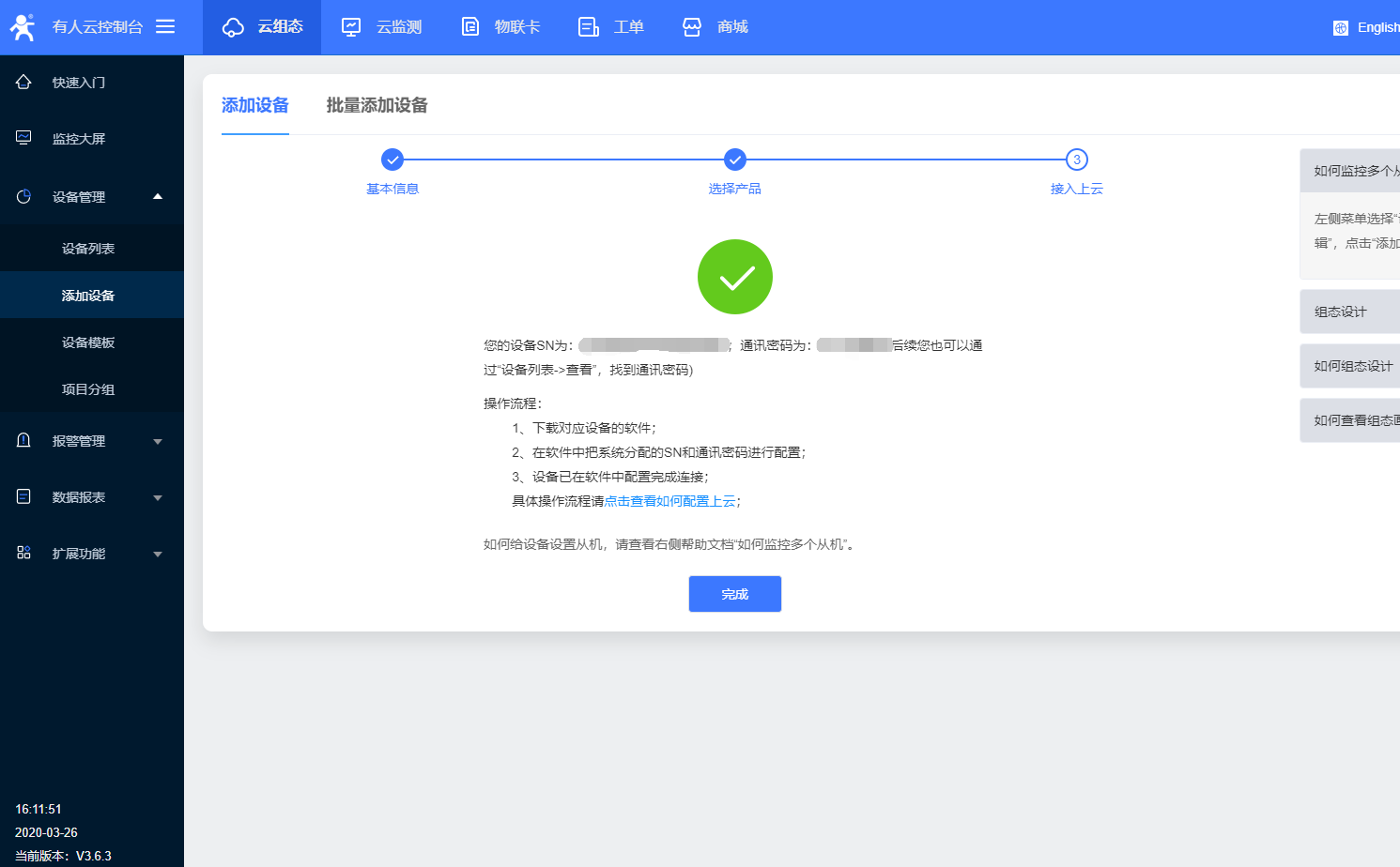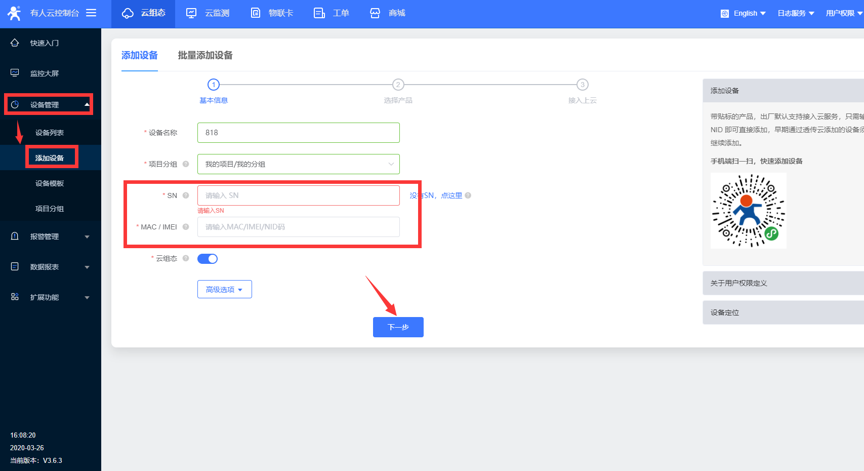 1、選擇 設(shè)備管理》添加設(shè)備,輸入設(shè)備的sn、mac點擊下一步