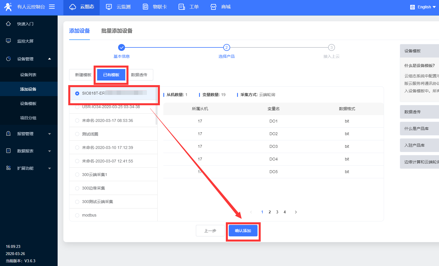 2、平臺自動生成設(shè)備對應(yīng)的模板,不用更改直接點擊確認(rèn)添加