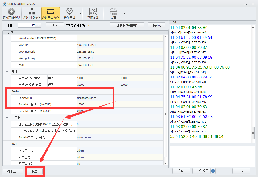 1、在下圖位置設(shè)置服務(wù)器地址跟端口:clouddata.usr.cn,15000,設(shè)置好參數(shù)點以下空白處,右側(cè)有正確log打印后點擊重啟