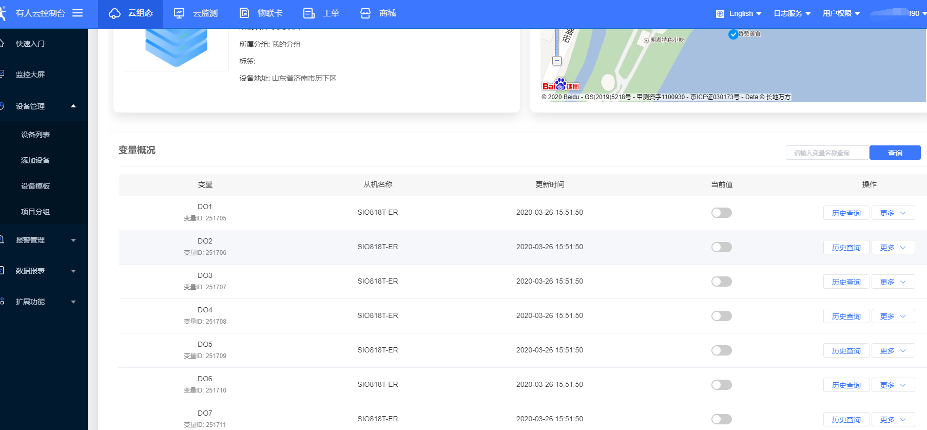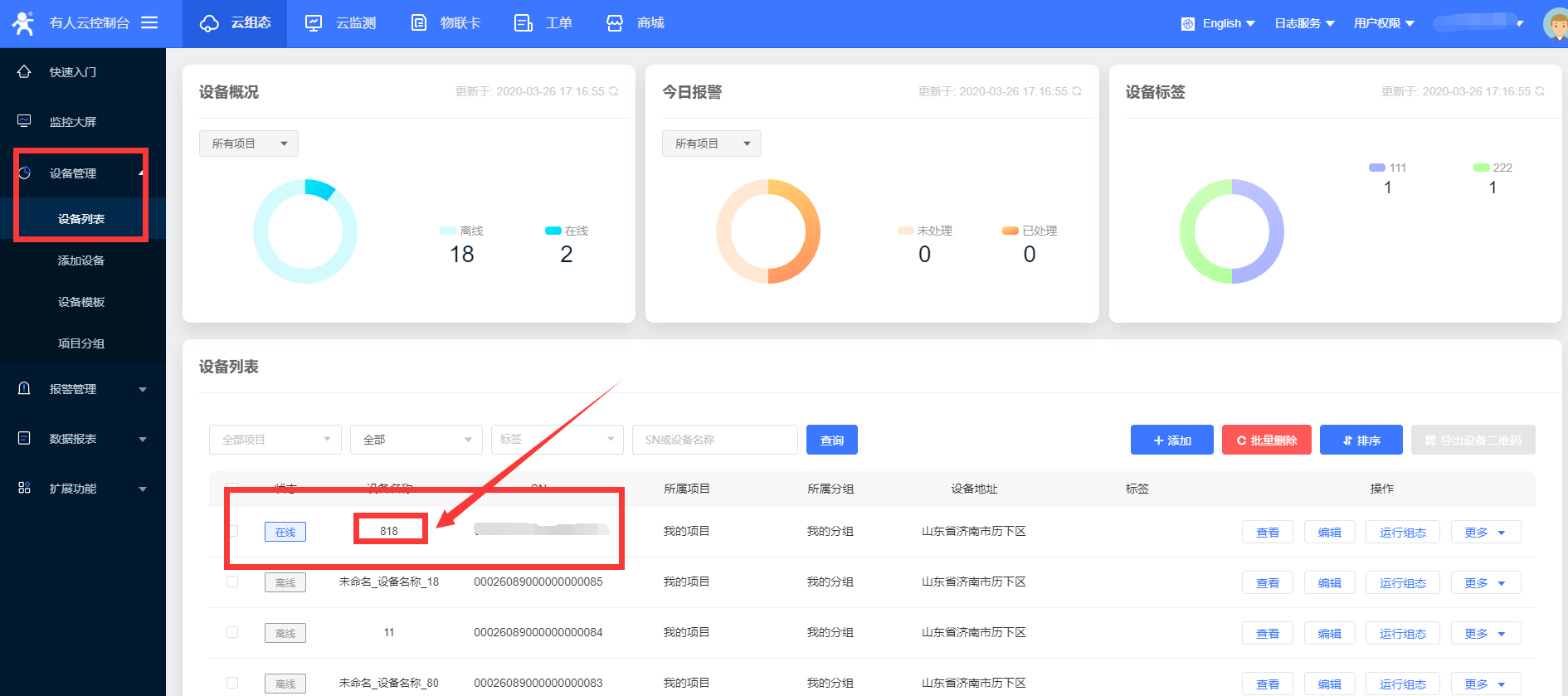 2、設(shè)備重啟后,云平臺上設(shè)備上線。點擊設(shè)備名稱即可看到數(shù)據(jù)