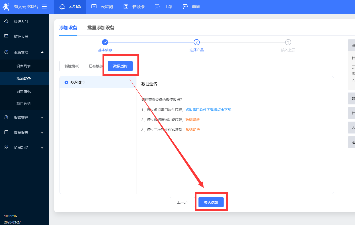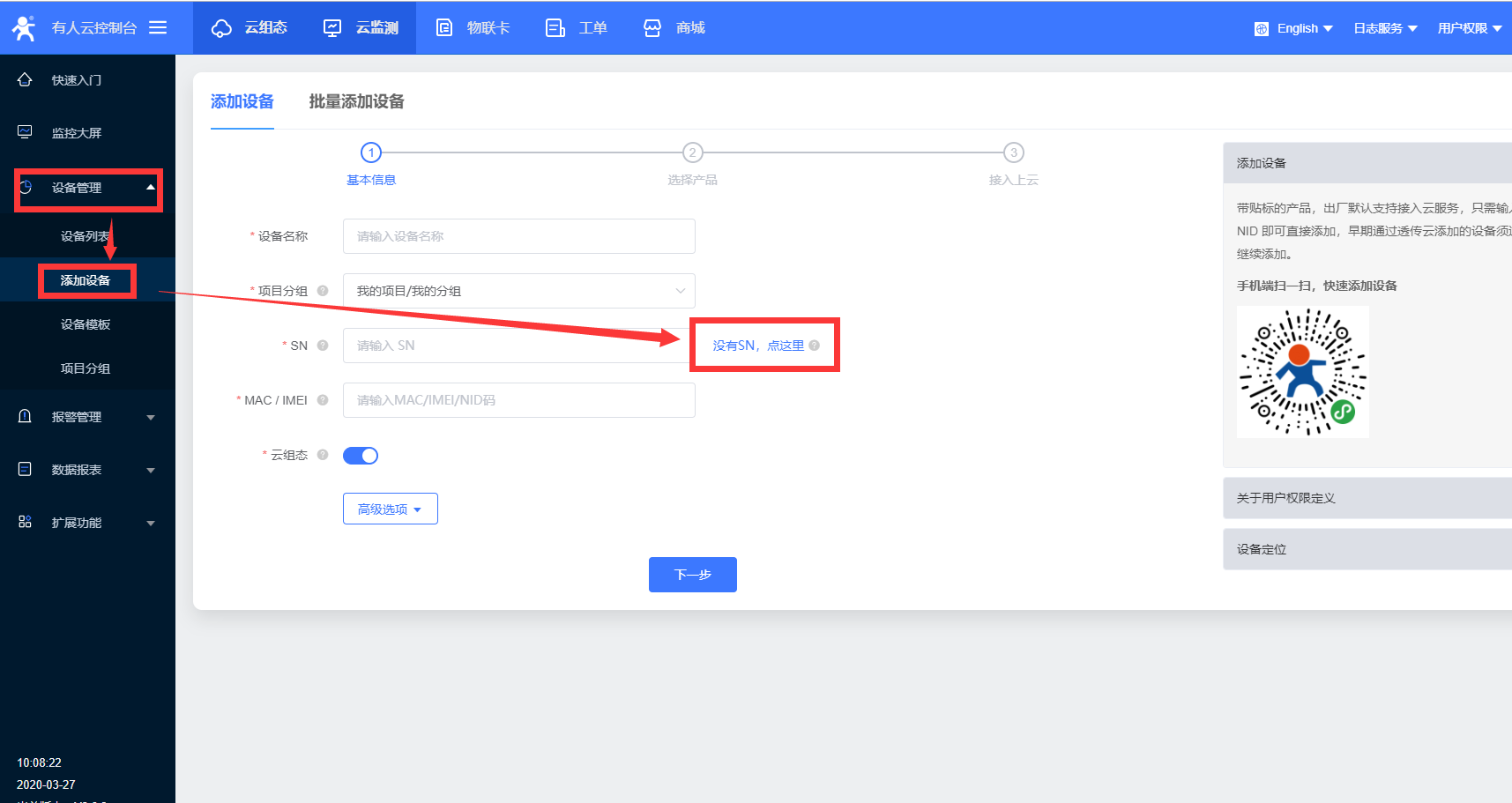 1、登陸云平臺(tái)后,在 設(shè)備管理》添加設(shè)備 中添加一個(gè)設(shè)備,點(diǎn)擊框后面的藍(lán)字“沒有SN”