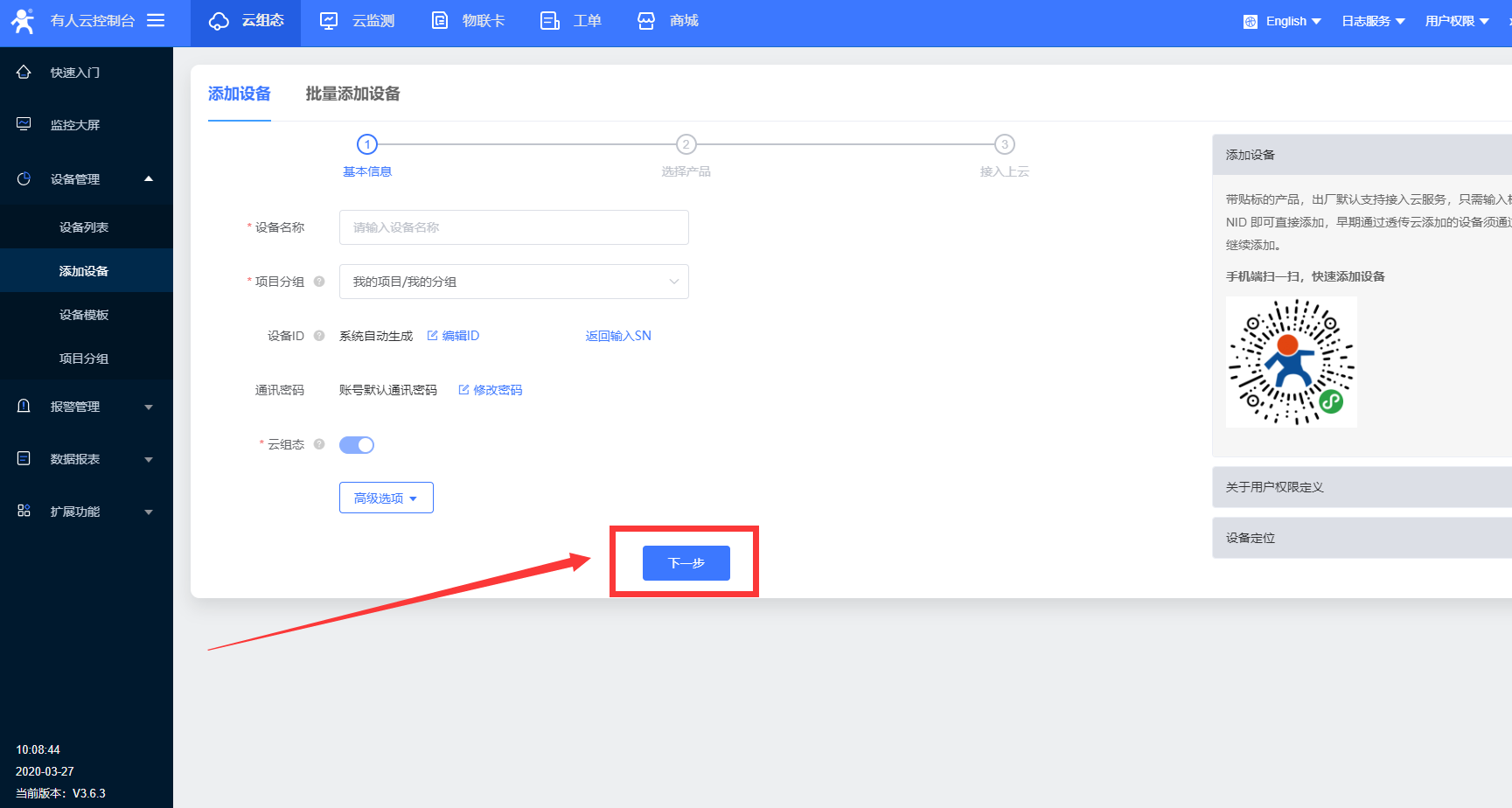 2、填寫好對(duì)應(yīng)的信息,設(shè)備id通訊密碼不用設(shè)置由系統(tǒng)自動(dòng)生成即可,直接點(diǎn)擊下一步